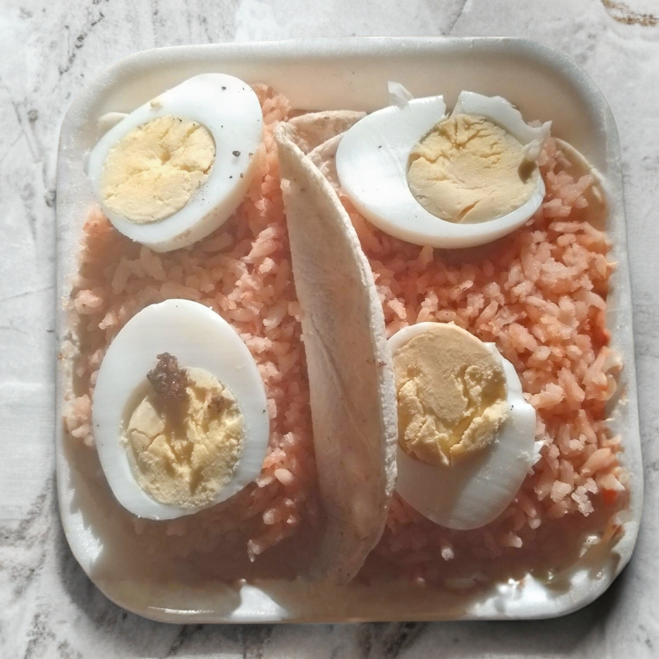 3 tortillas , arroz, huevo, salsa.