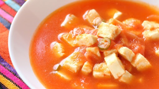 Con 3 tortillas de máquina arroz y guisado de queso en salsa de jitomate