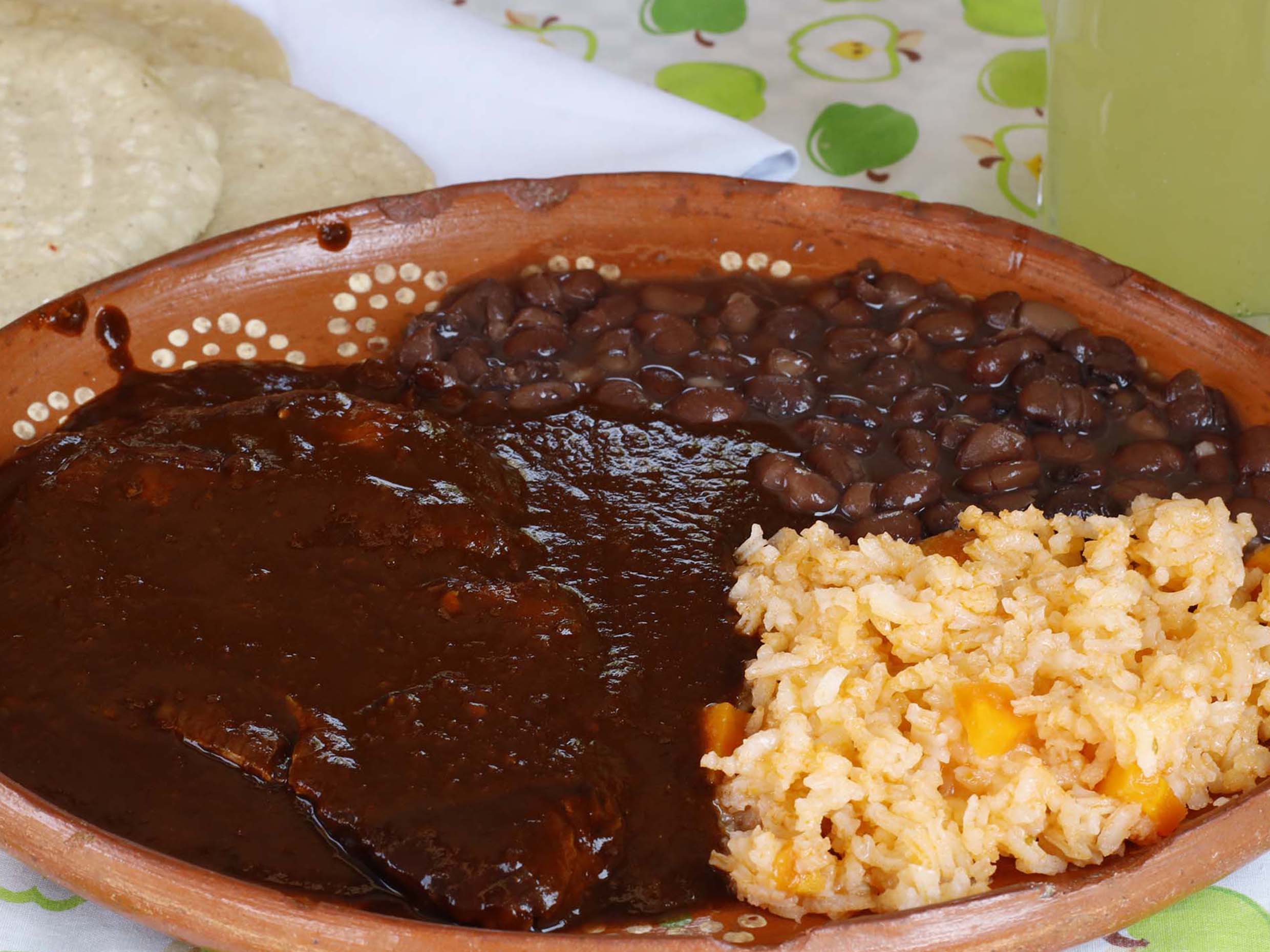 Con tres tortillas a mano con pechuga deshebrada guisada mole rojo y arroz