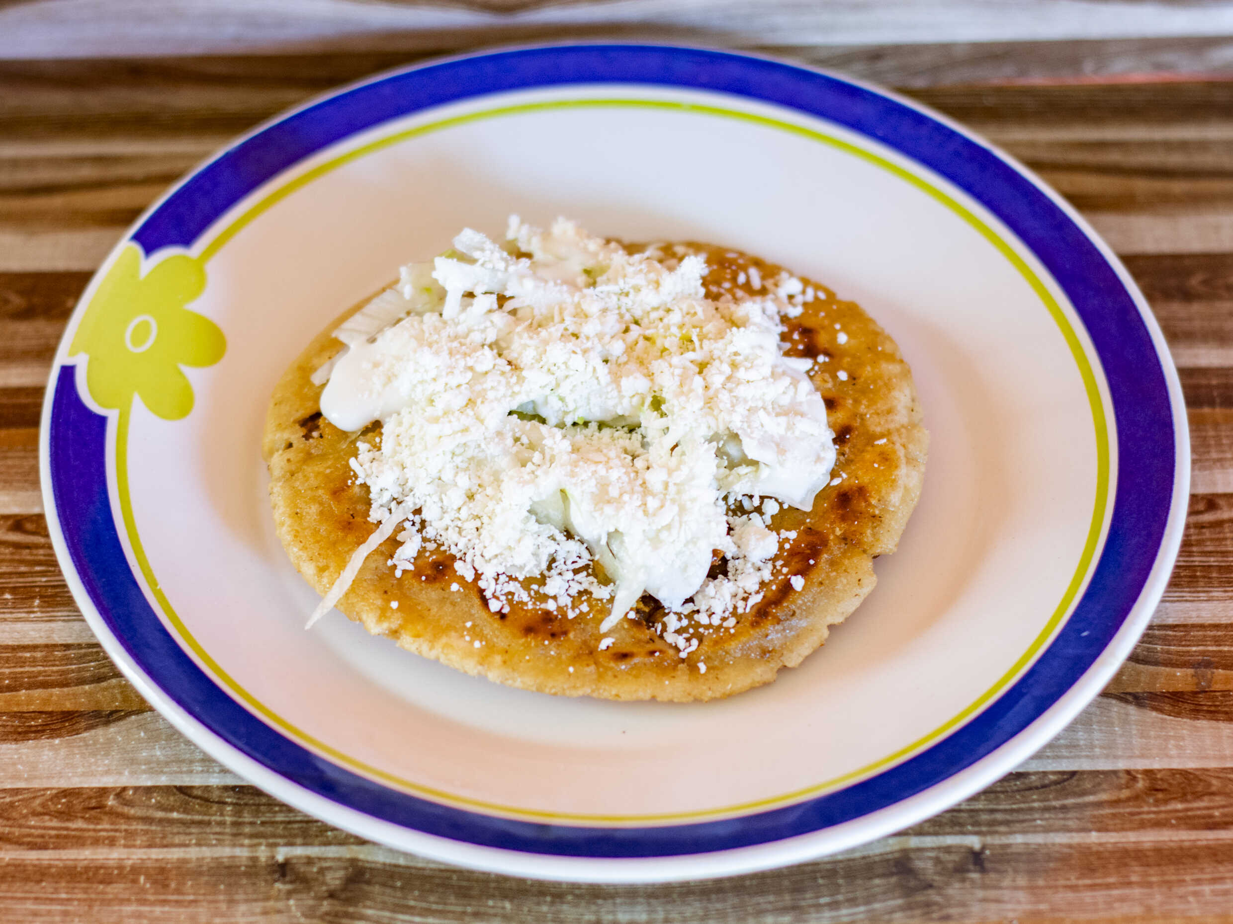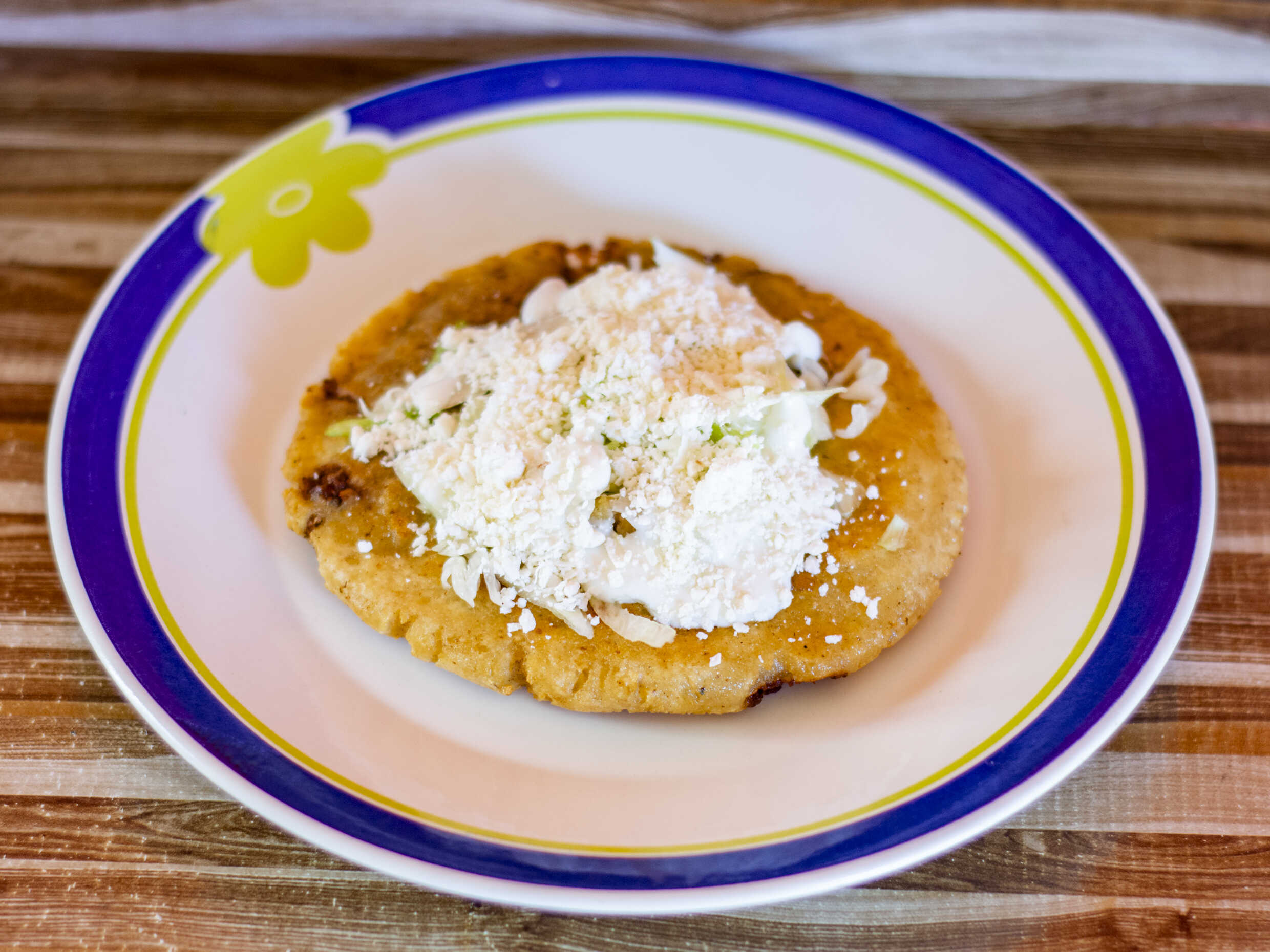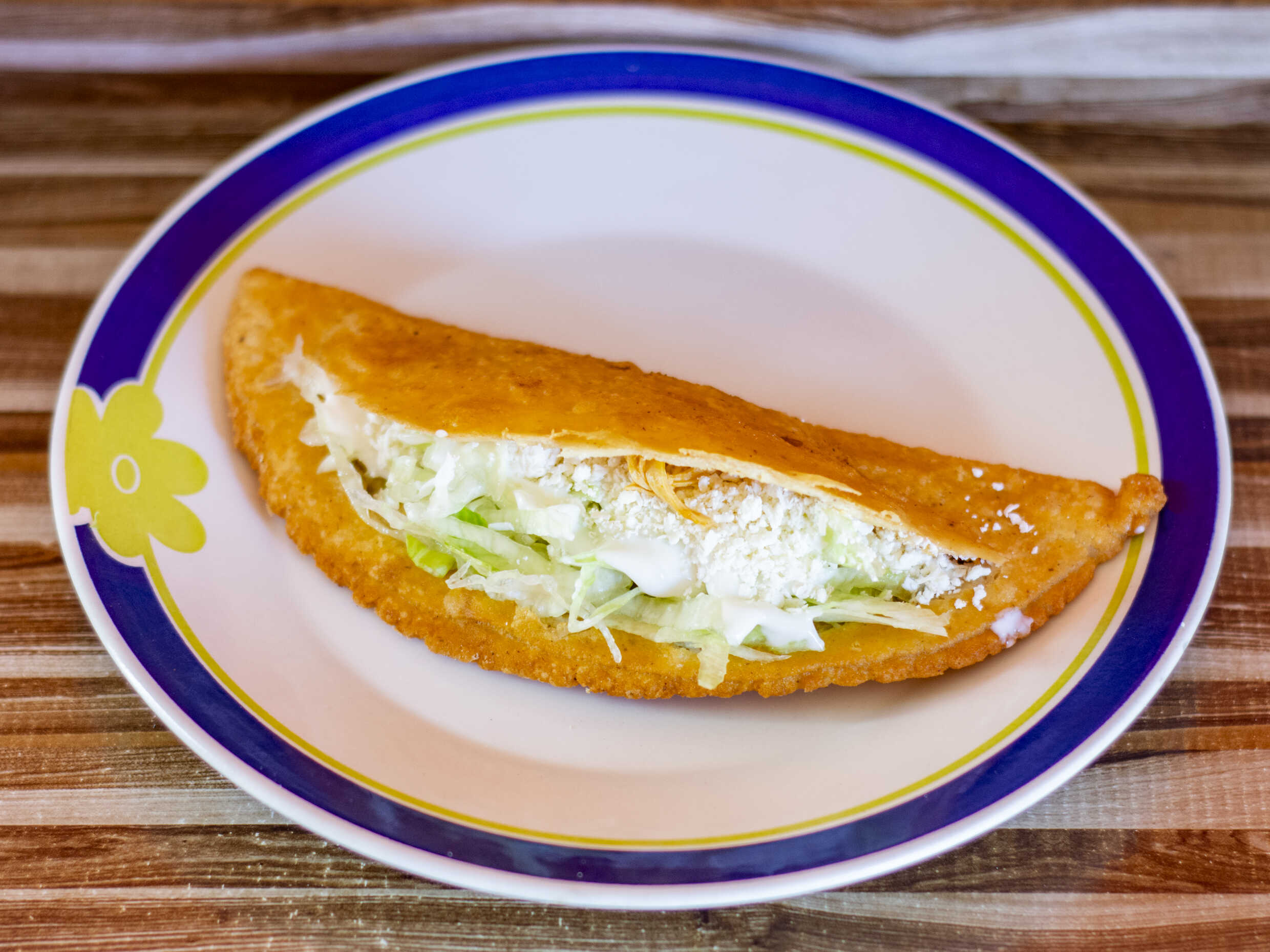 Deliciosa gordita frita de frijol rellena de queso Oaxaca, con lechuga crema y queso rayado