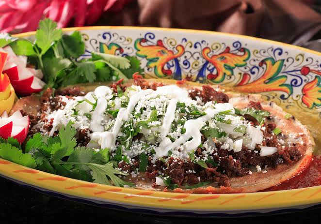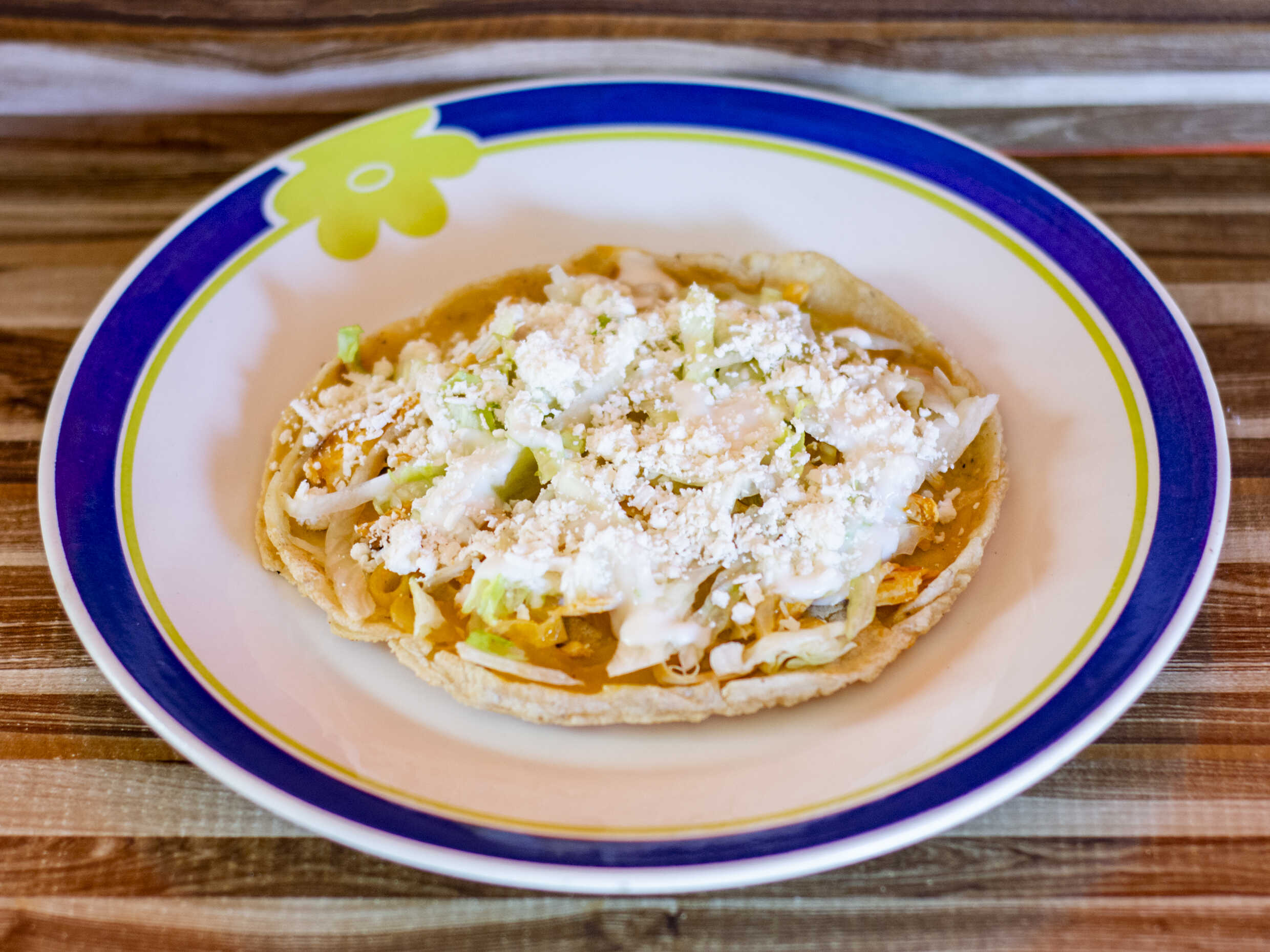 Delicioso sope preparado ok carne enchilada, con lechuga, crema y queso rayado