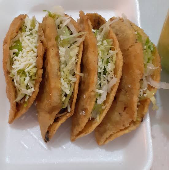 Quesadilla frita de papas con rajas combinada con queso Oaxaca, lechuga crema queso rayado