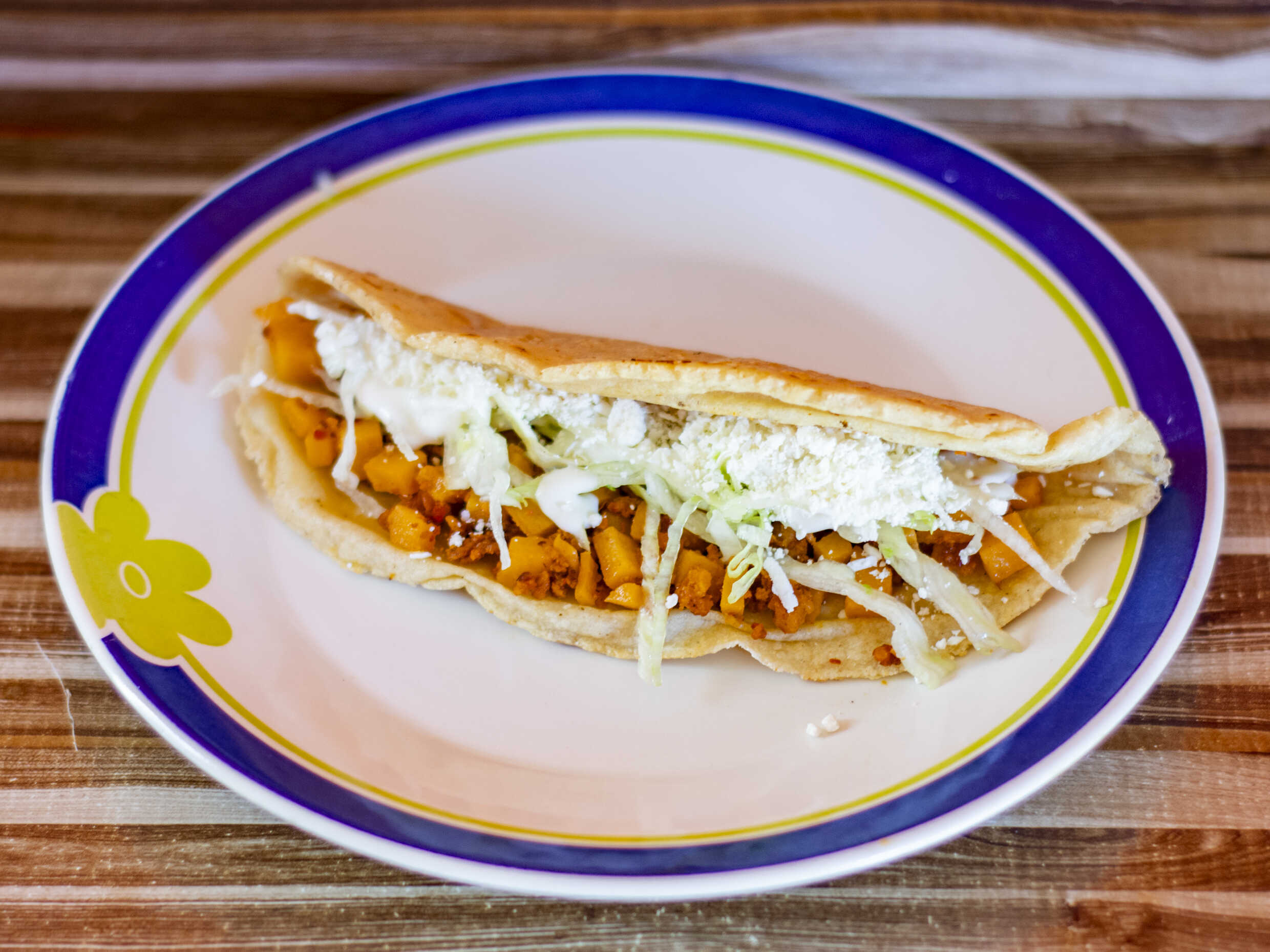 Deliciosa gordita frita de frijol rellena de longaniza con papas, con lechuga crema y queso rayado