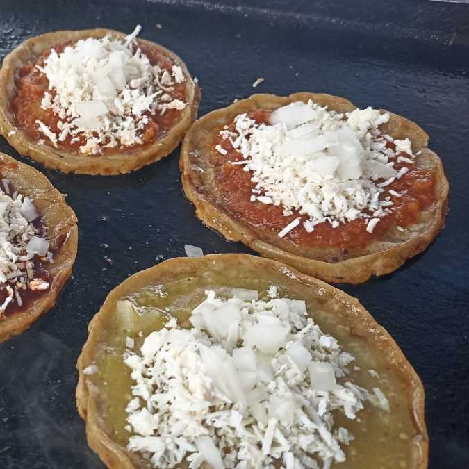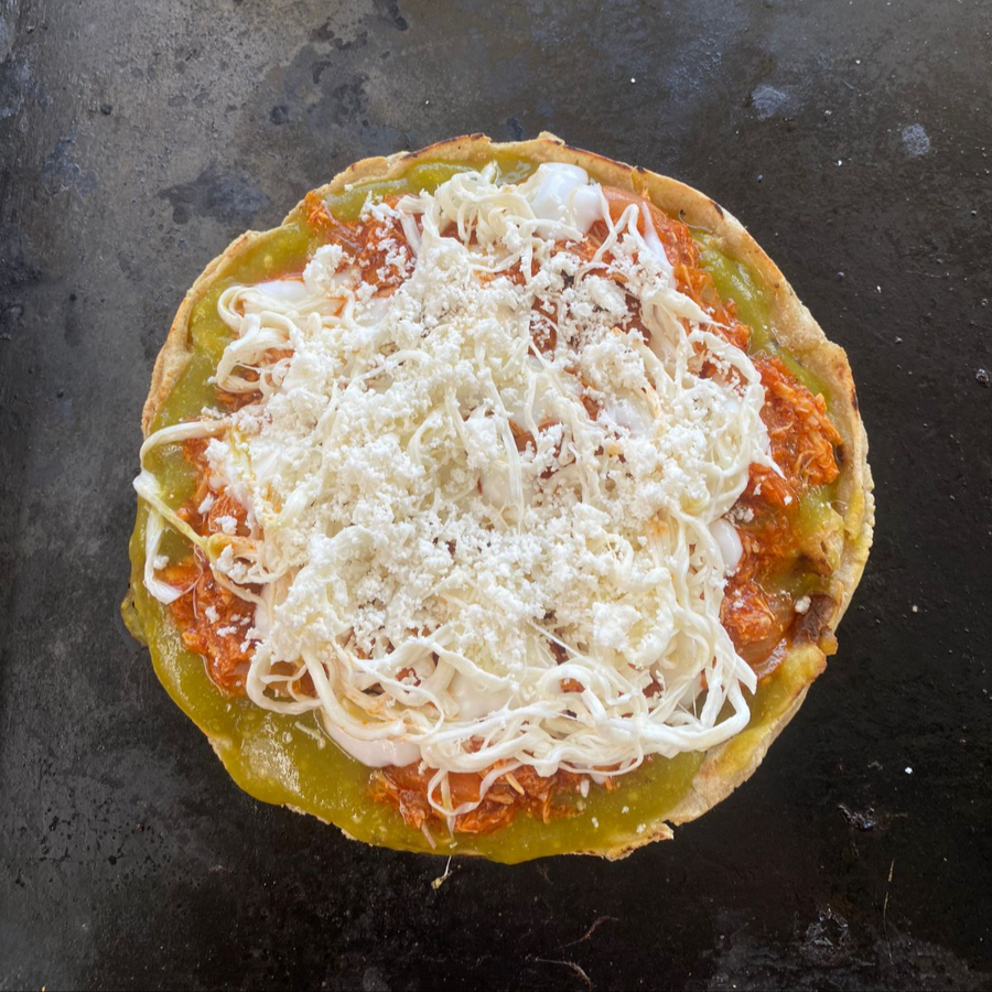 es una picada de tinga lleva queso ,crema y salsa de su preferencia