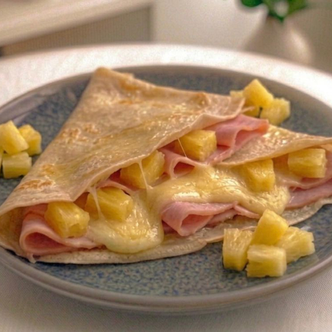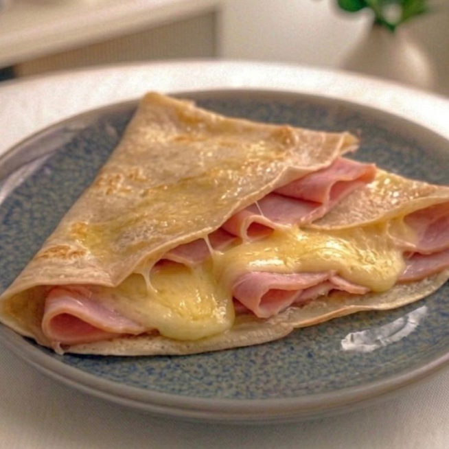 Deliciosa crepa rellena de queso Manchego y rebanadas de jamón de Pavo