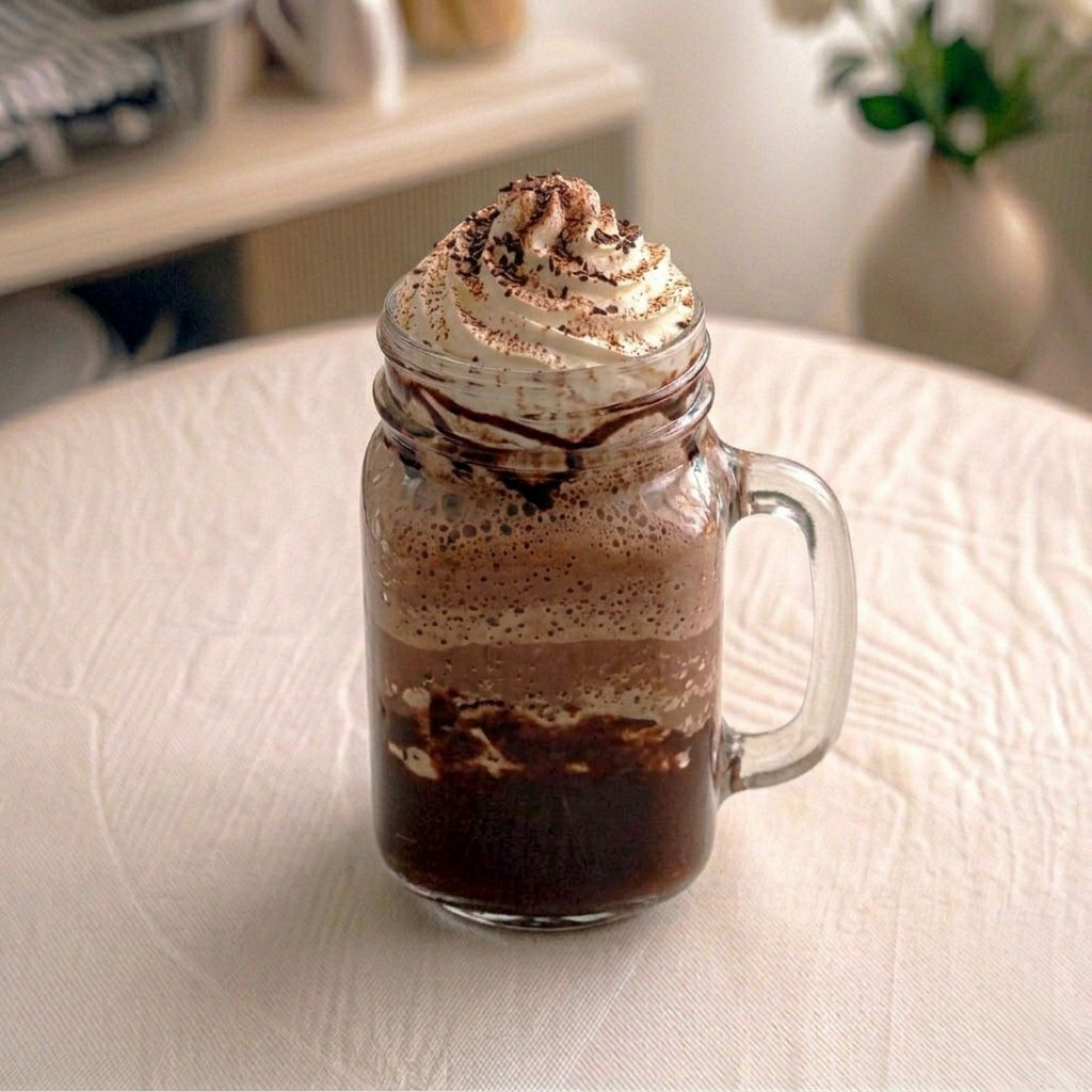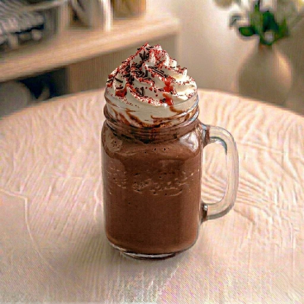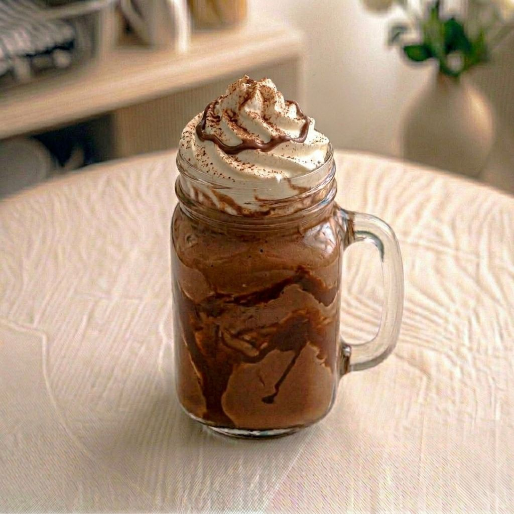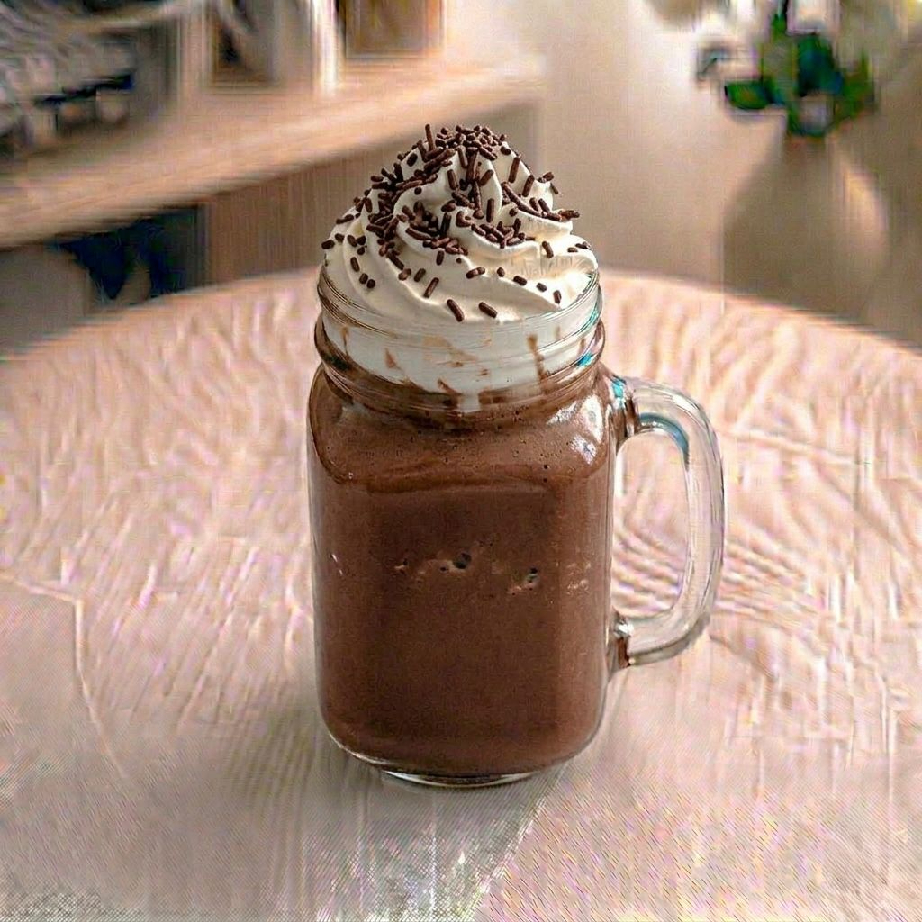 Malteada de chocolate, cremosa, fría y deliciosamente dulce.