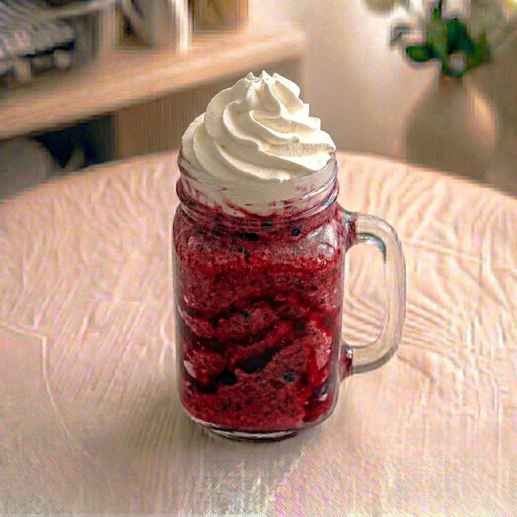 Delicioso Frappe a base de frutos rojos naturales, con crema batida, decorado con sirope de Hershey´s sabor fresa.