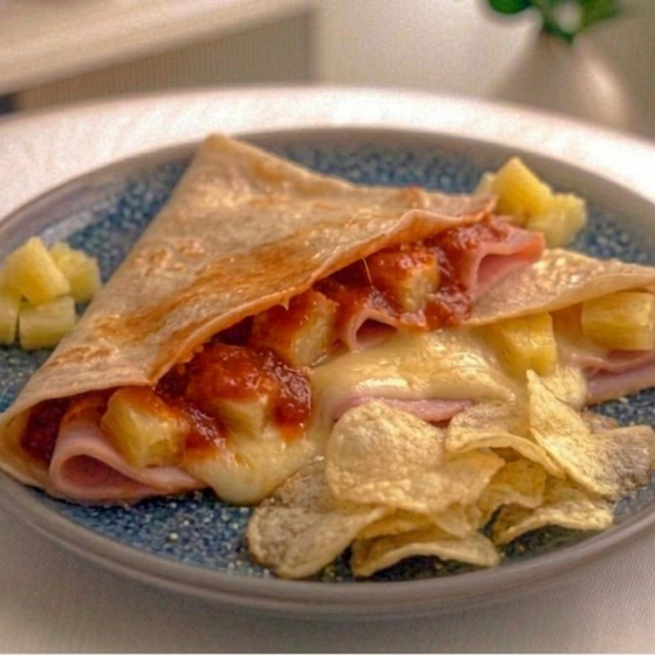 Deliciosa Crepa Rellena de Queso Manchego, Jamón y piña, acompañada de papas fritas naturales