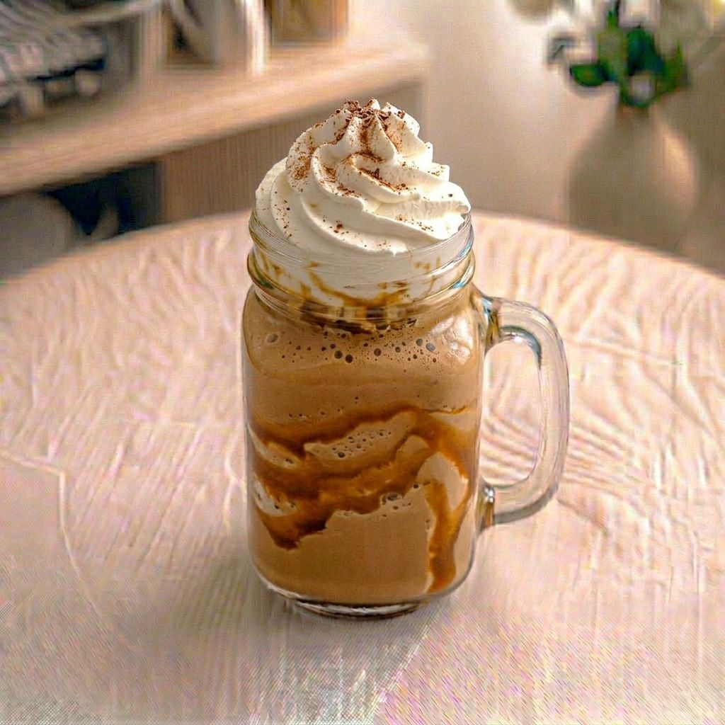 Delicioso frappé con nuestra mezcla especial de café acompañado de cajeta, crema batida, chispas turín, bañada con un toque de cajeta.