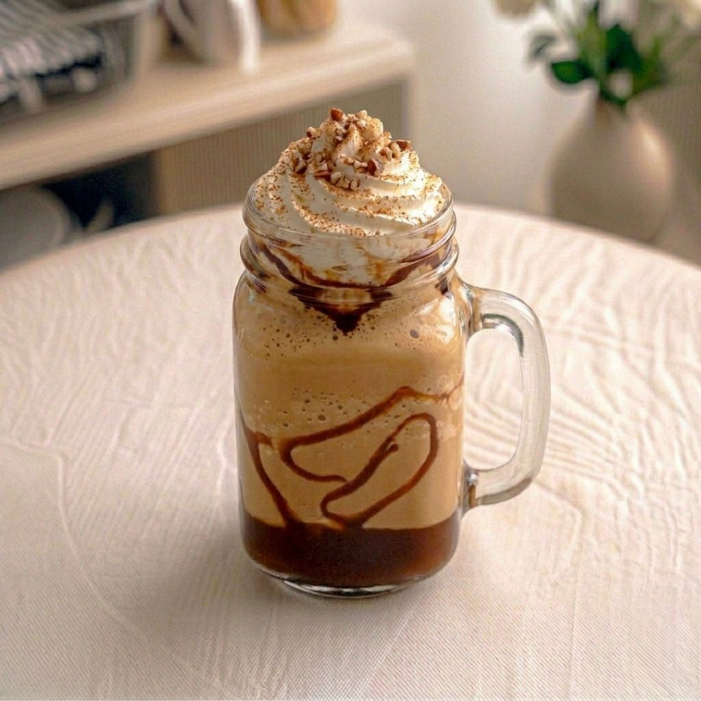 Delicioso frappé con nuestra mezcla especial de café, con sabor a avellana, crema batida, chispas turín, decorado con lineas de Nutella