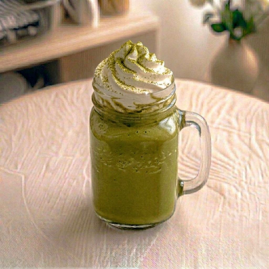 Delicioso frappé a base de Matcha, con crema batida, decorado con polvo de Matcha encima.