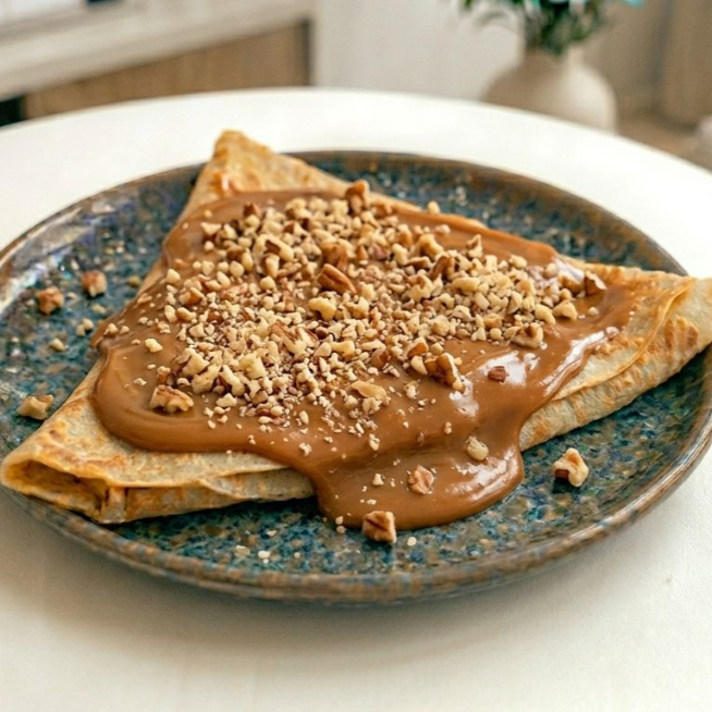 Deliciosa Crepa rellena de Cajeta y cubierta con una capa de Nuez