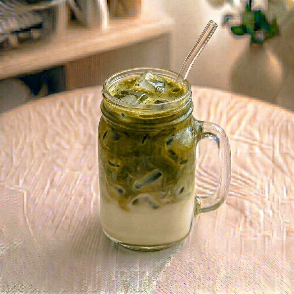 Té Matcha mezclado con leche fría, cremoso y refrescante.
