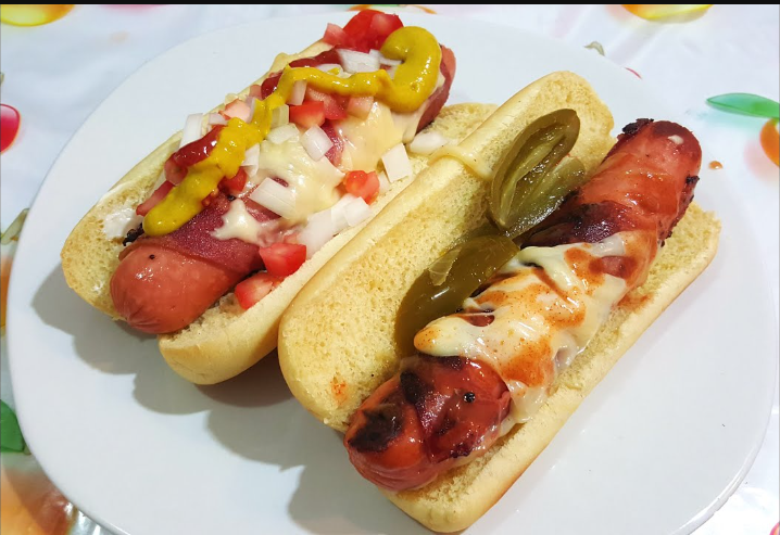 Pan, salchicha Fud, queso oaxaca, tocino, jitomate, cebolla, cátsup y queso líquido.