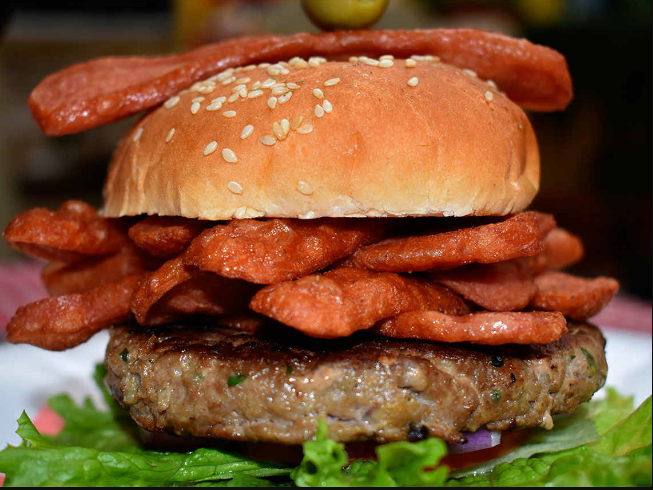 Deliciosa hamburguesa con 100 g de carne, jamón, salchicha, tocino, queso oaxaca, queso amarillo, cátsup, queso líquido, jitomate, pepino, cebolla, lechuga y chiles jalapeños en vinagre.