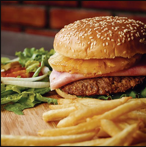 Deliciosa hamburguesa con 100 g de carne, jamón, queso americano, piña, tocino, queso oaxaca, cátsup, queso líquido, jitomate, pepino, cebolla y lechuga.