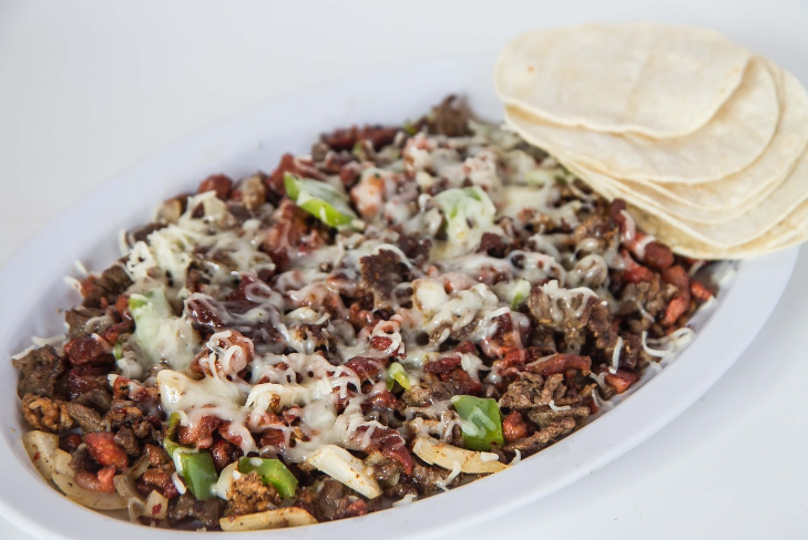 carde de res con longaniza, tortillinas, jamon y queso fundido.