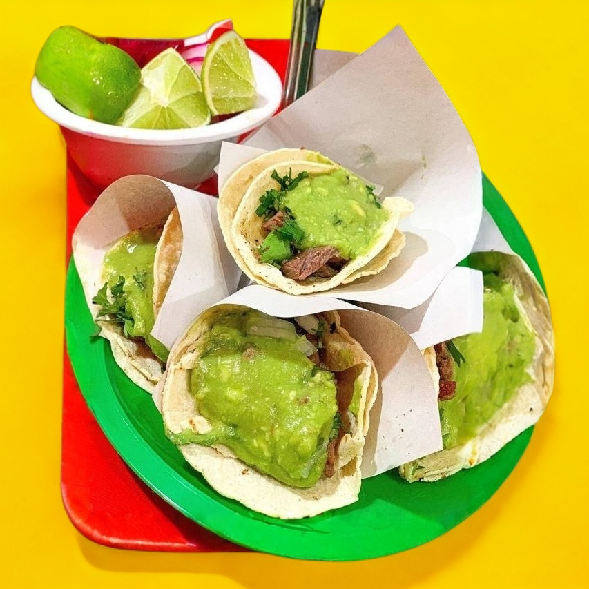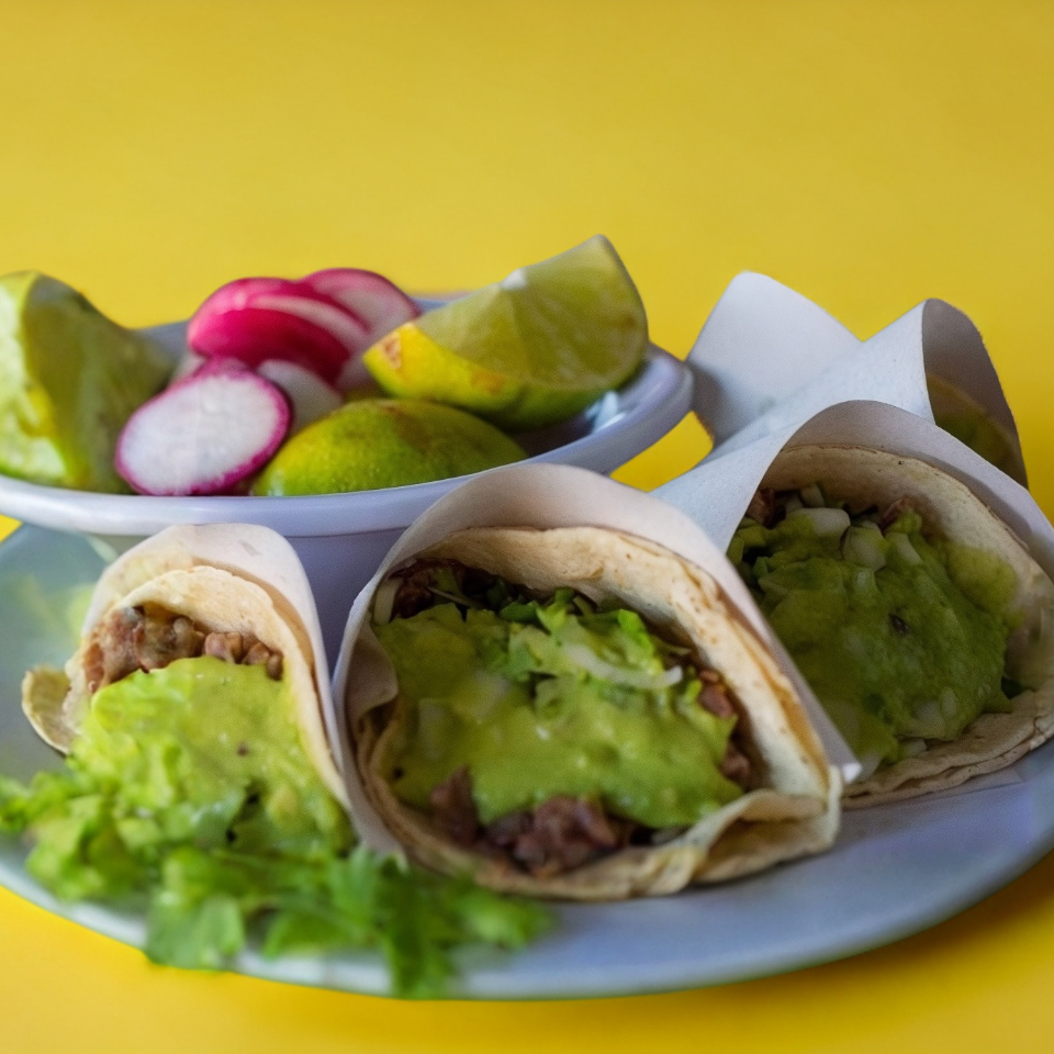 Tortilla de maíz, carnes de tu elección, guacamole, cebolla y cilantro.