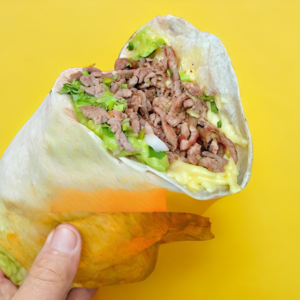 Tortilla de harina grande, carne de tu elección, queso, aguacate, cebolla y cilantro.