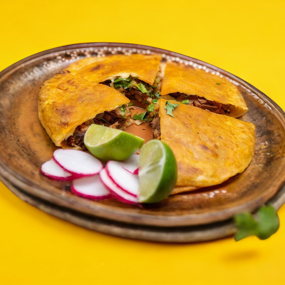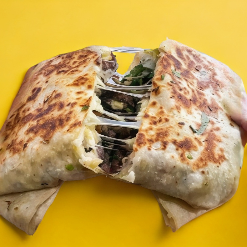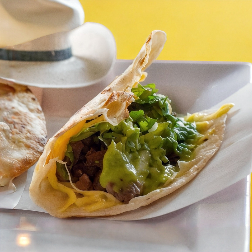 Doble tortilla de harina, carne de tu elección, queso, aguacate, cebolla y cilantro.