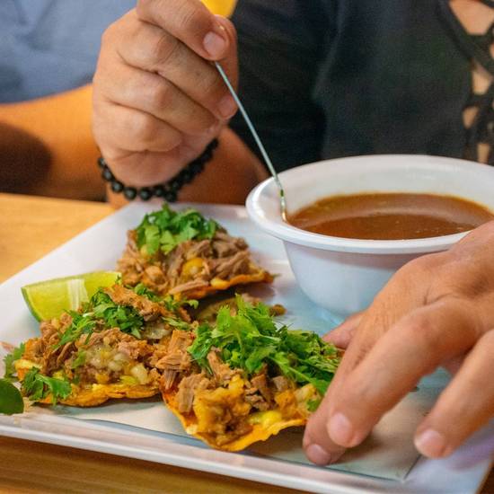 Carne de birria 1/4 kg, 10 tortillas de maíz, 5 tortillas de maíz doradas, 1/2 litro de caldo de la casa, cilantro, cebolla, cilantro, rábano y limón.