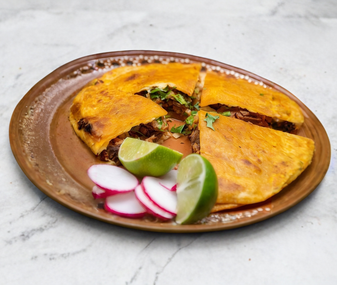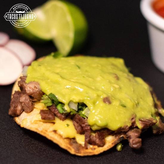 Tortilla de maíz dorada al carbón con carne a tu elección, queso, aguacate, cebolla y cilantro, acompañada de queso blanco, limones, salsa y rábanos.