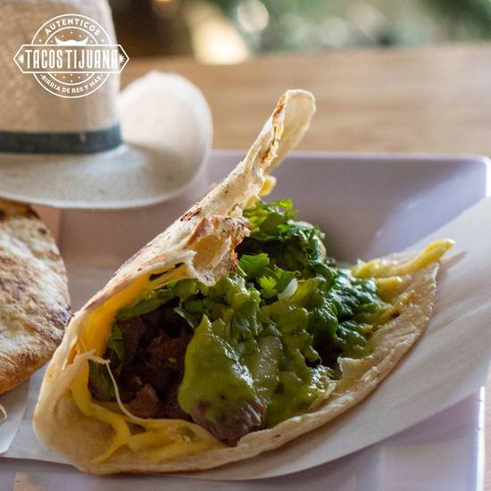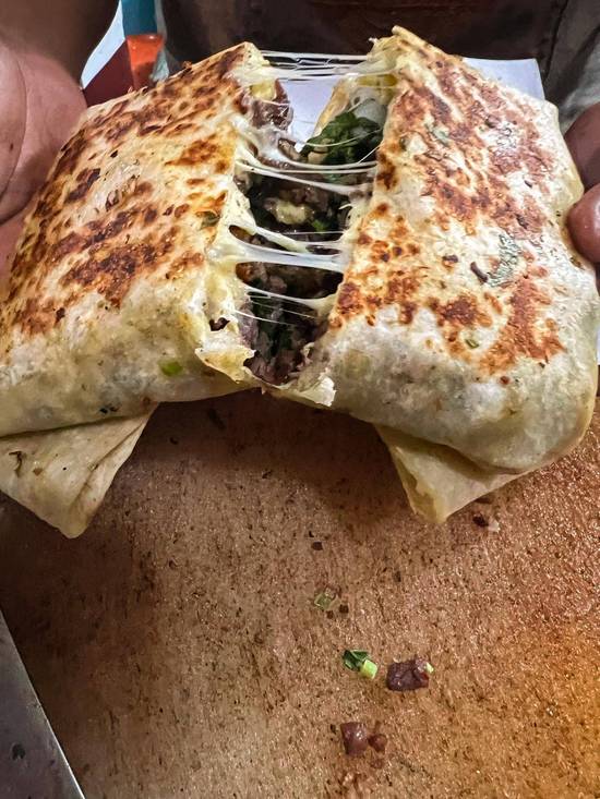 Tortilla de harina grande, carne de tu elección, queso, aguacate, cebolla y cilantro.