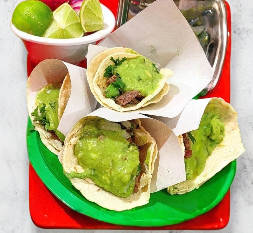 Tortilla de maíz, carnes de tu elección, guacamole, cebolla y cilantro.