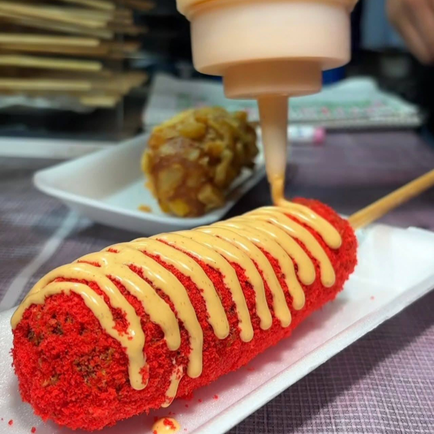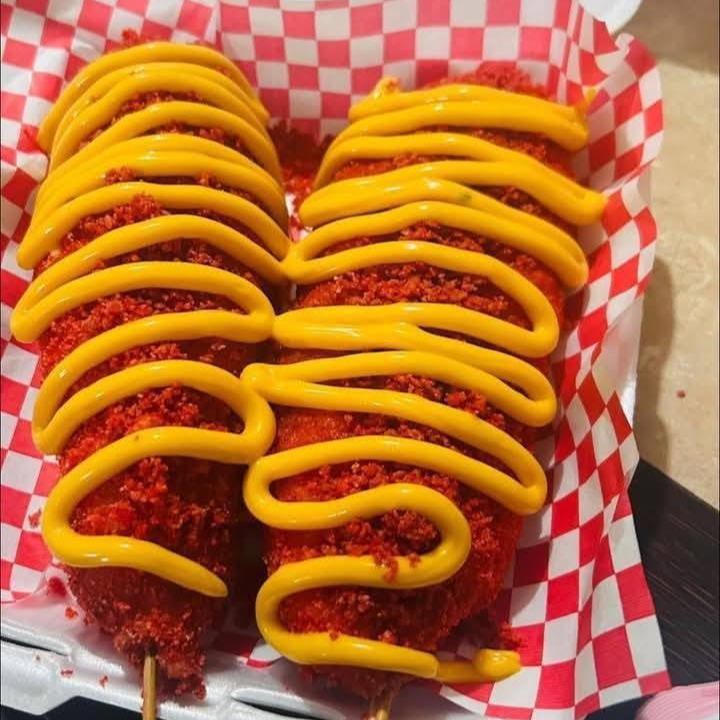 Banderilla Mixta (Mitad queso mozzarella mitad salchica) con cobertura de Flaming Hot