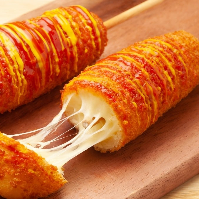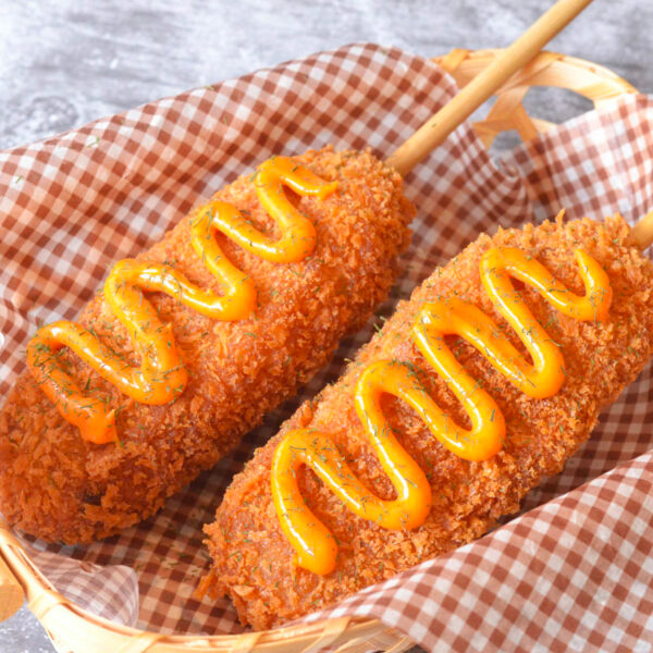 Banderilla Mixta (Mitad queso mozzarella mitad salchicha) cubierta con Panko (Pan molido en Hojuela Orieltal)