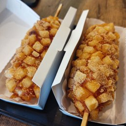 Banderilla Mixta ( Mitad queso mozzarela mitad Salchicha) cubierta de cubitos de papa natural