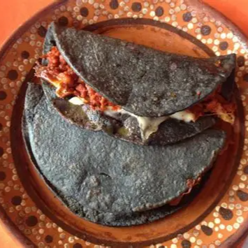 Hecha con maza azul, rellena de frijol molido