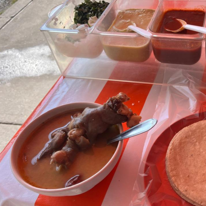 jugo del chivo y borrego cocidos a fuego lento con carne dentro, incluye 3 tortillas de maiz a mano