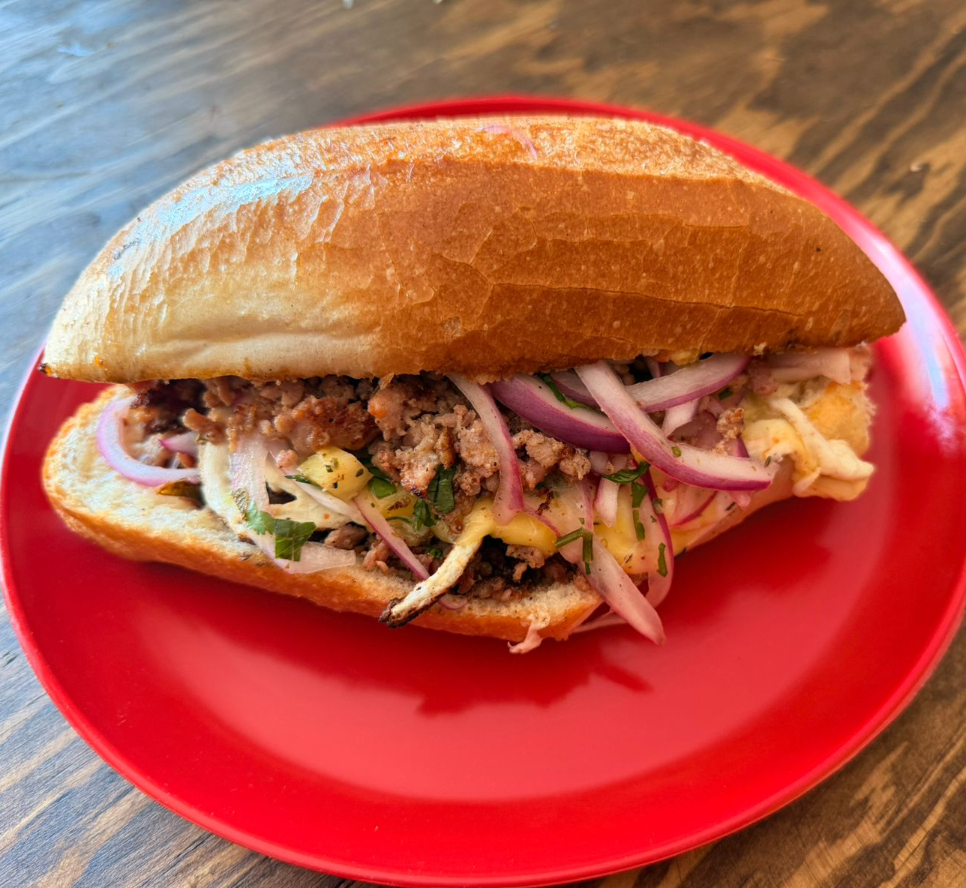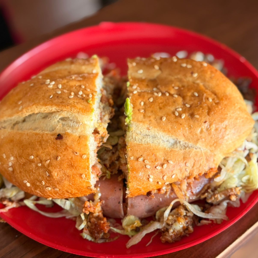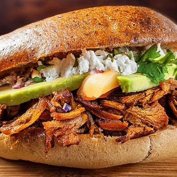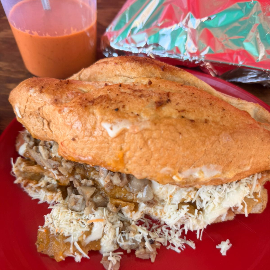 Pan bolillo Jumbo de masa madre relleno de tierno suadero y queso.