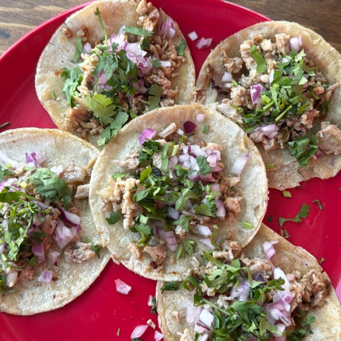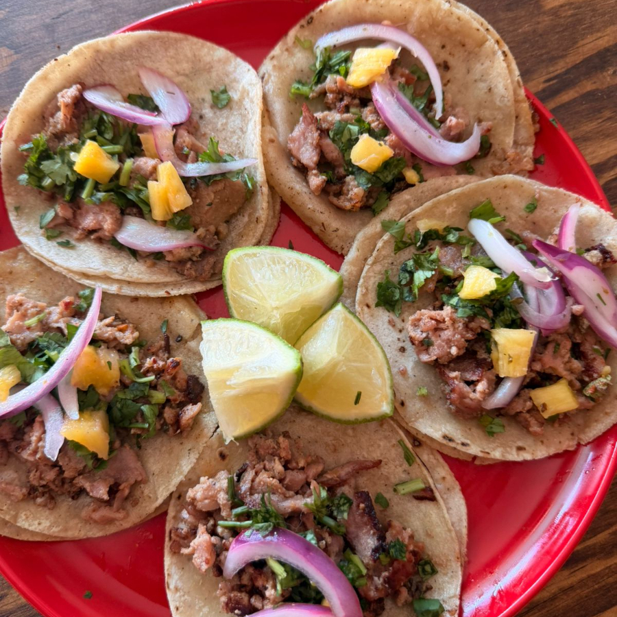 Orden de cinco tacos de pastor, con cilantro y cebolla