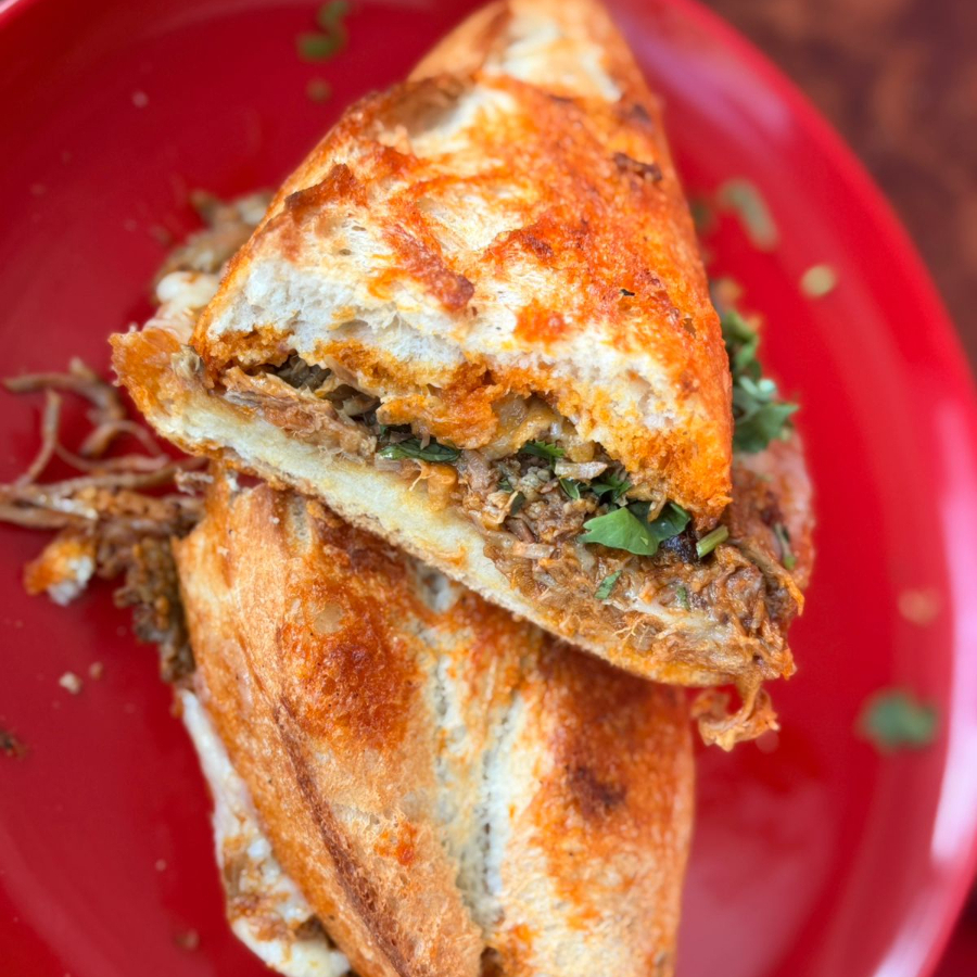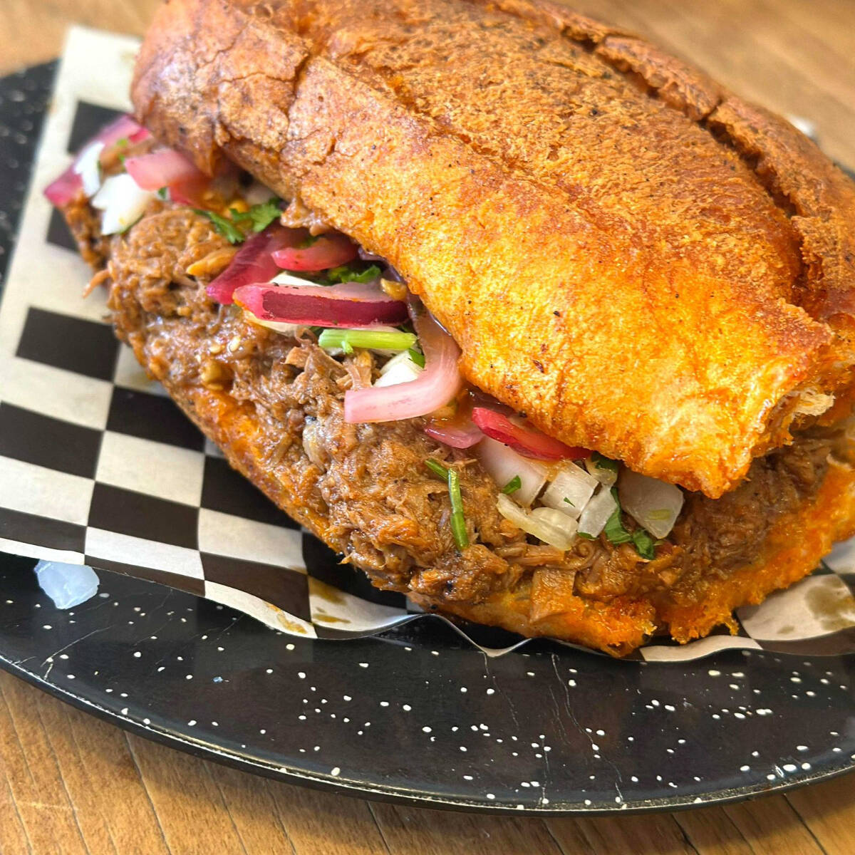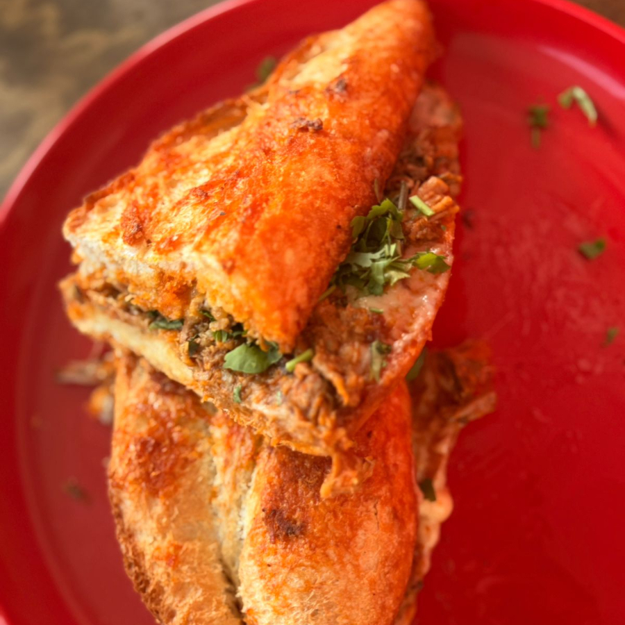 Bolillo jumbo de masa madre crujiente con barbacoa y queso fundido.