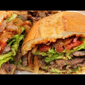 Telera jumbo, bistec, jamón, queso, lechuga, jitomate y cebolla.