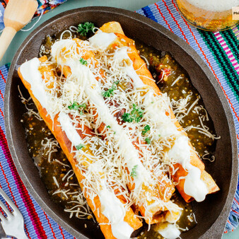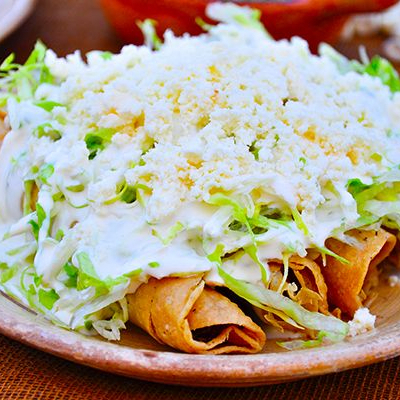 Tortillas para flauta, suadero, bañado en salsa sin picante, crema queso y lechuga.