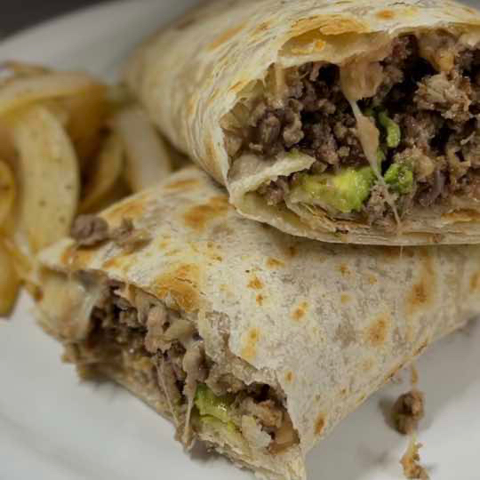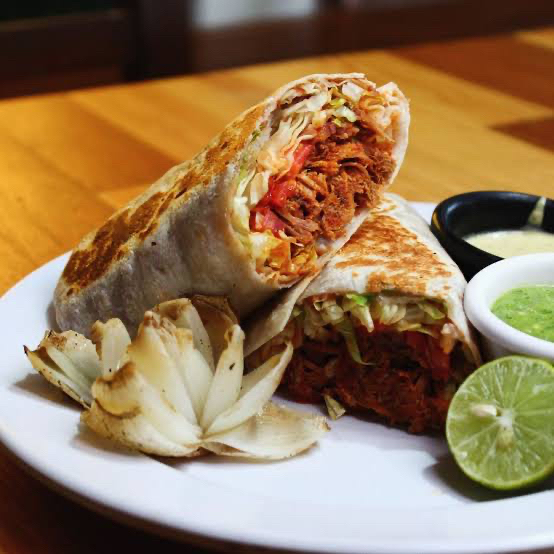 Tortilla jumbo, frijoles, barbacoa, queso y lechuga.