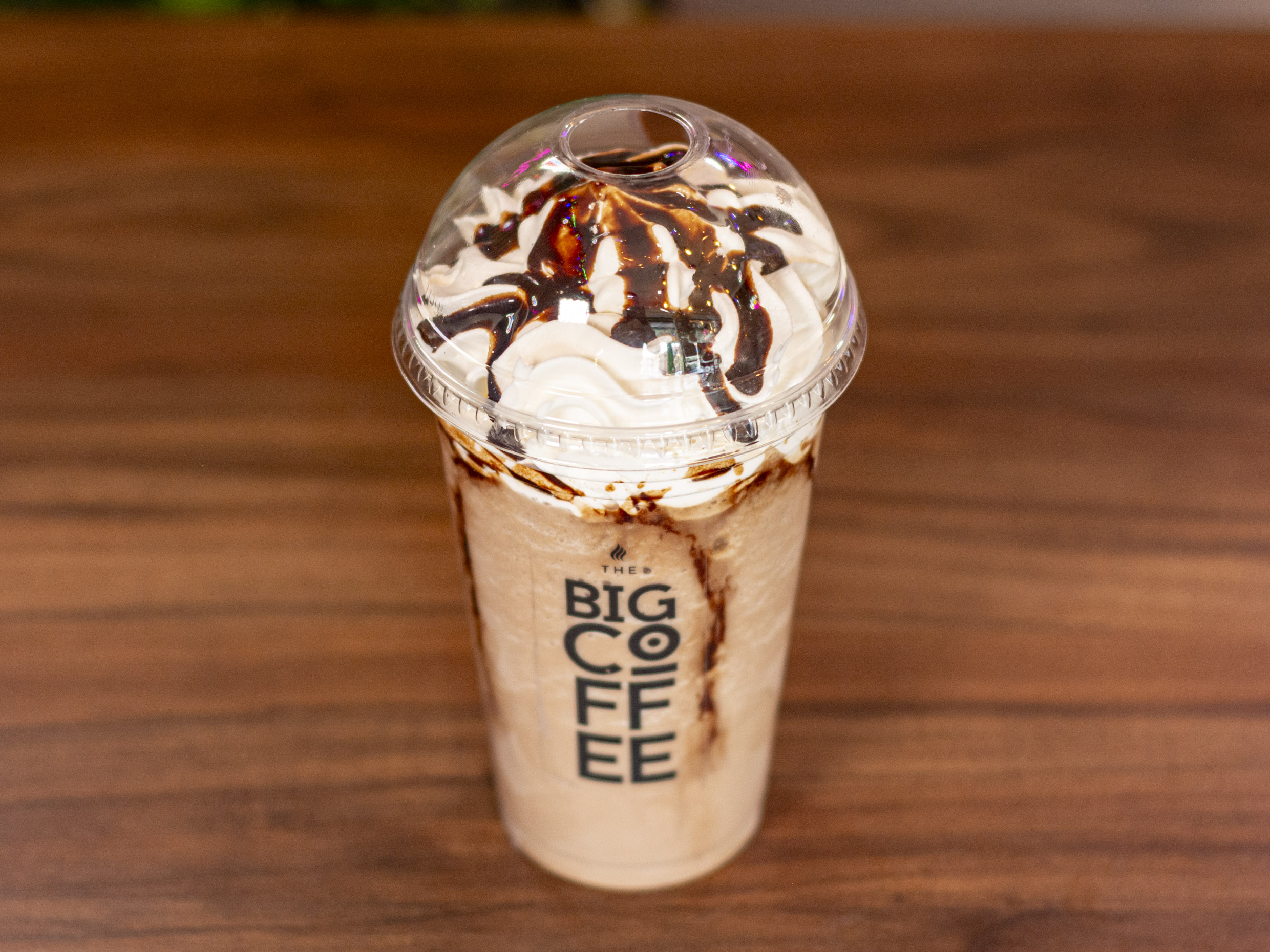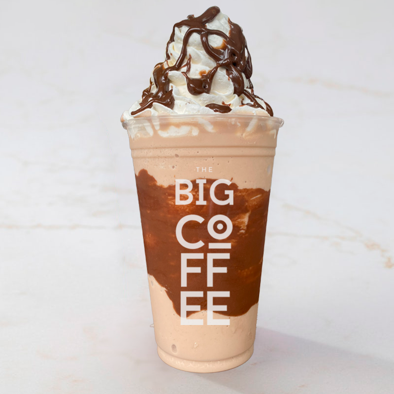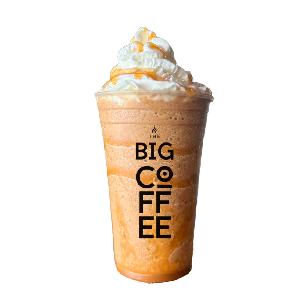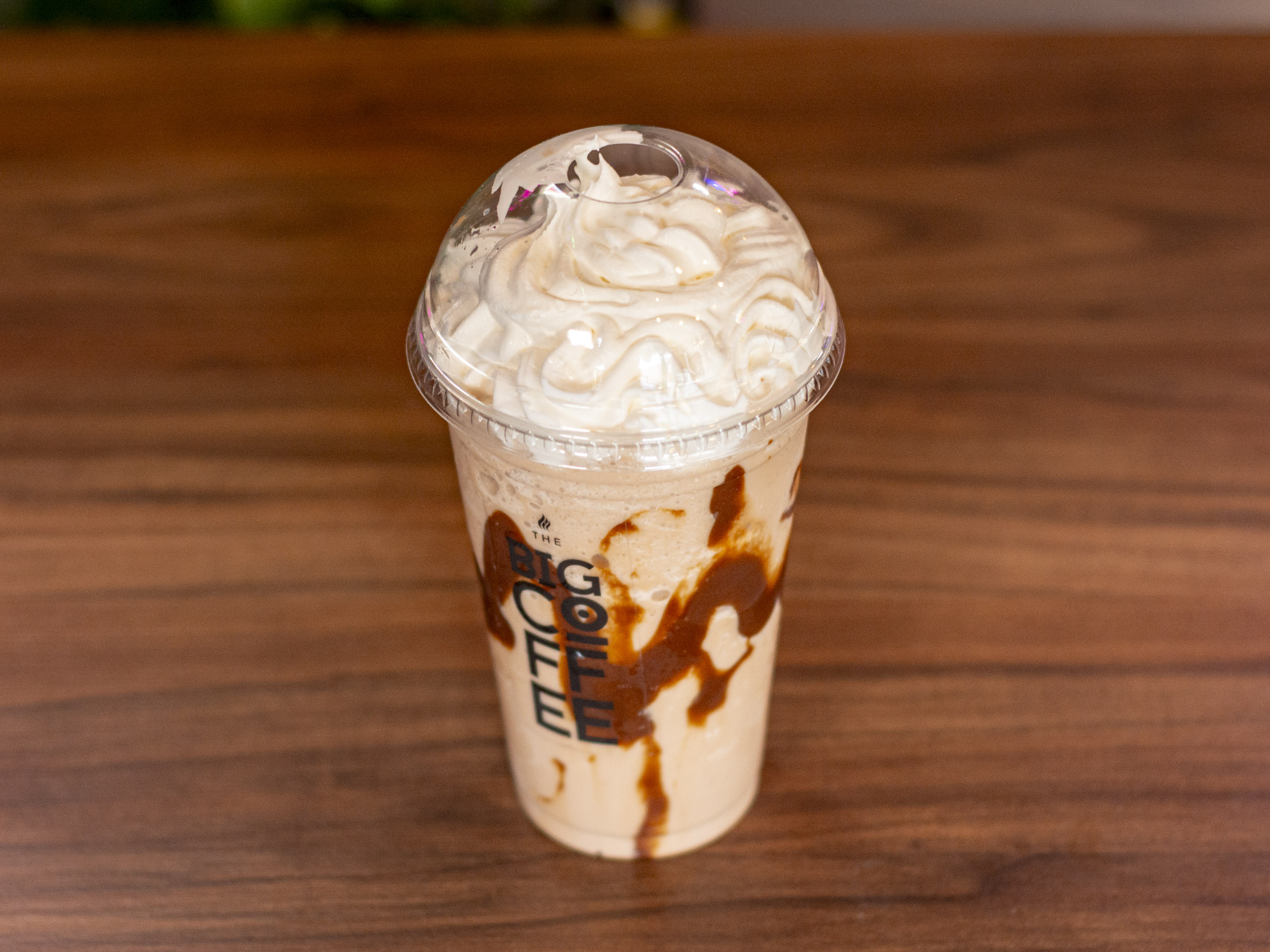 Frappé de café, mezclado con leche cremosa y salsa de caramelo, coronado con crema batida y un toque extra de caramelo