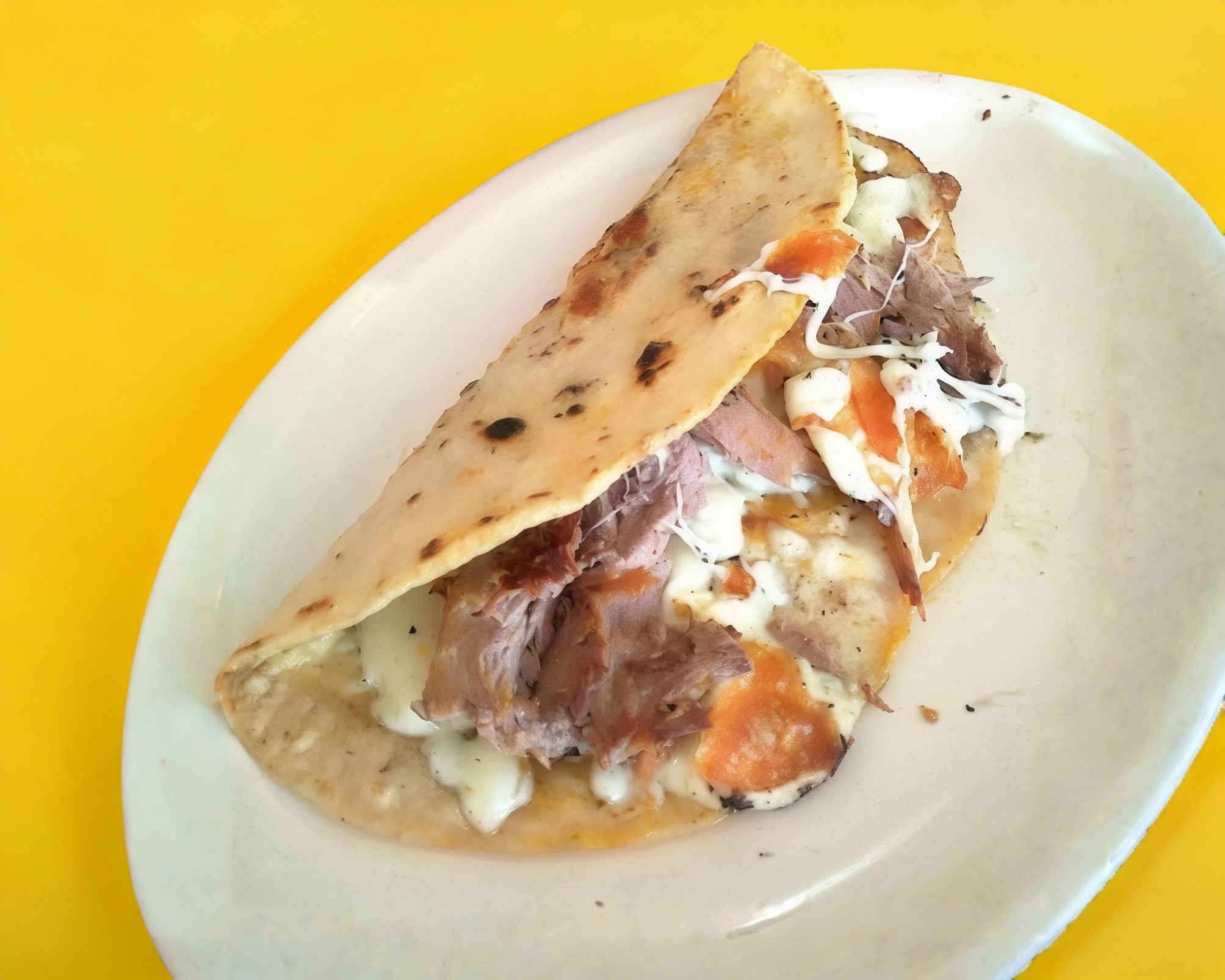 Tortilla grande al comal con delicioso queso chihuahua y carne de borrego. Se envía salsa, cebolla, cilantro y limón.