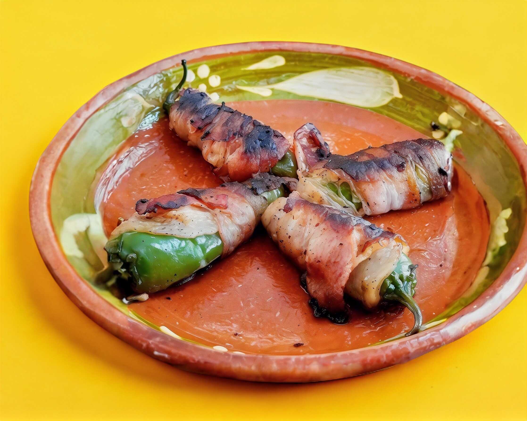 4 Jalapeños rellenos de queso chihuahua y envueltos en tocino, asados a la parrilla.
