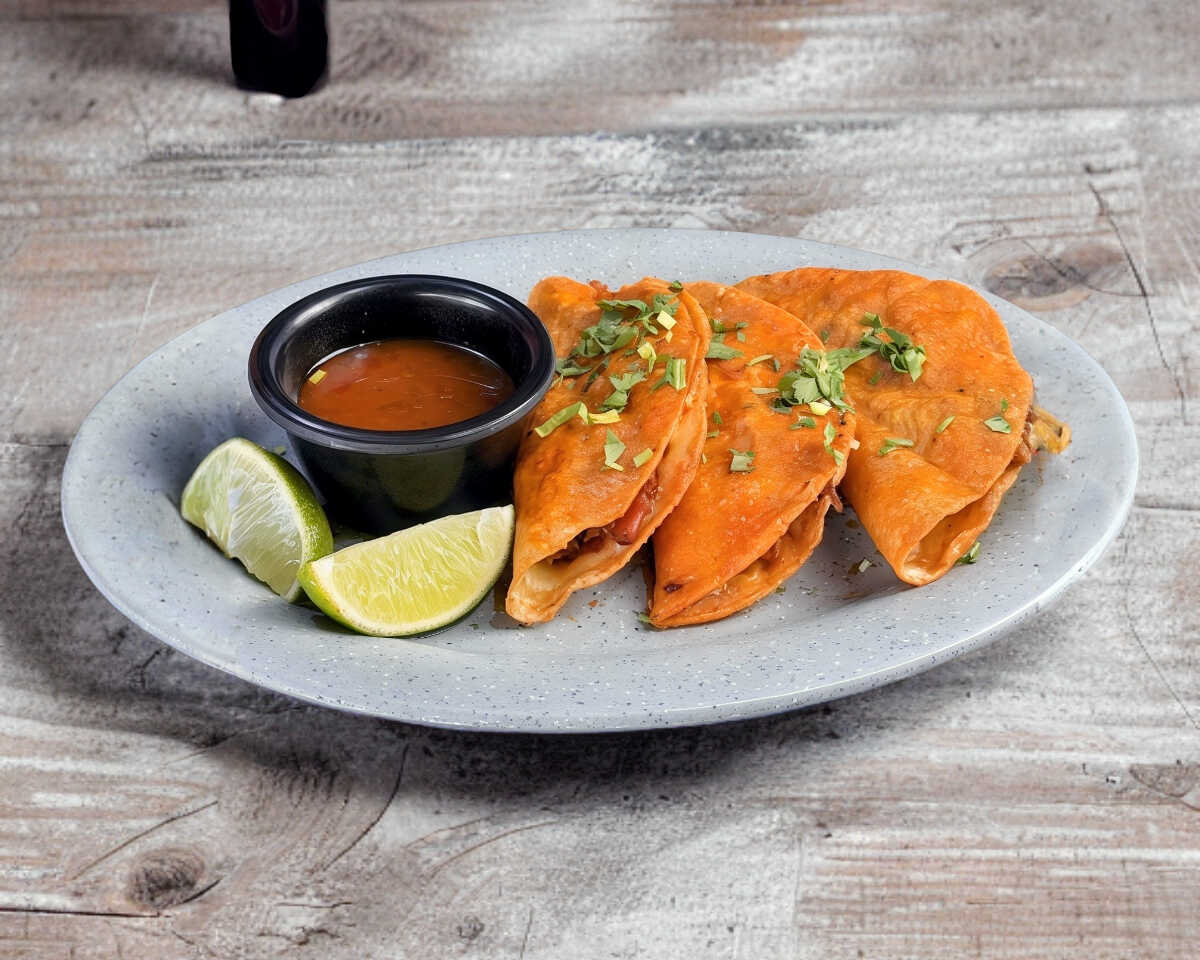 Deliciosas tortilla de maíz doradas en grasa de birria, rellenas de nuestra especial birria de res y queso chihuahua.