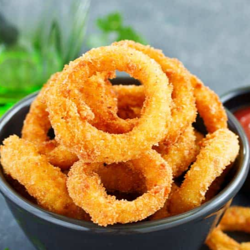 Deliciosos aros de cebolla acompañados de catsup o queso cheddar.