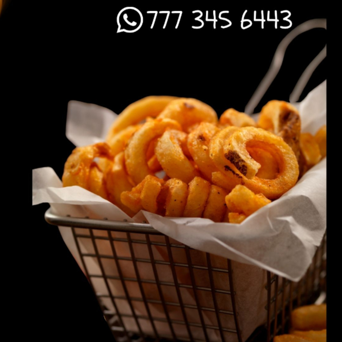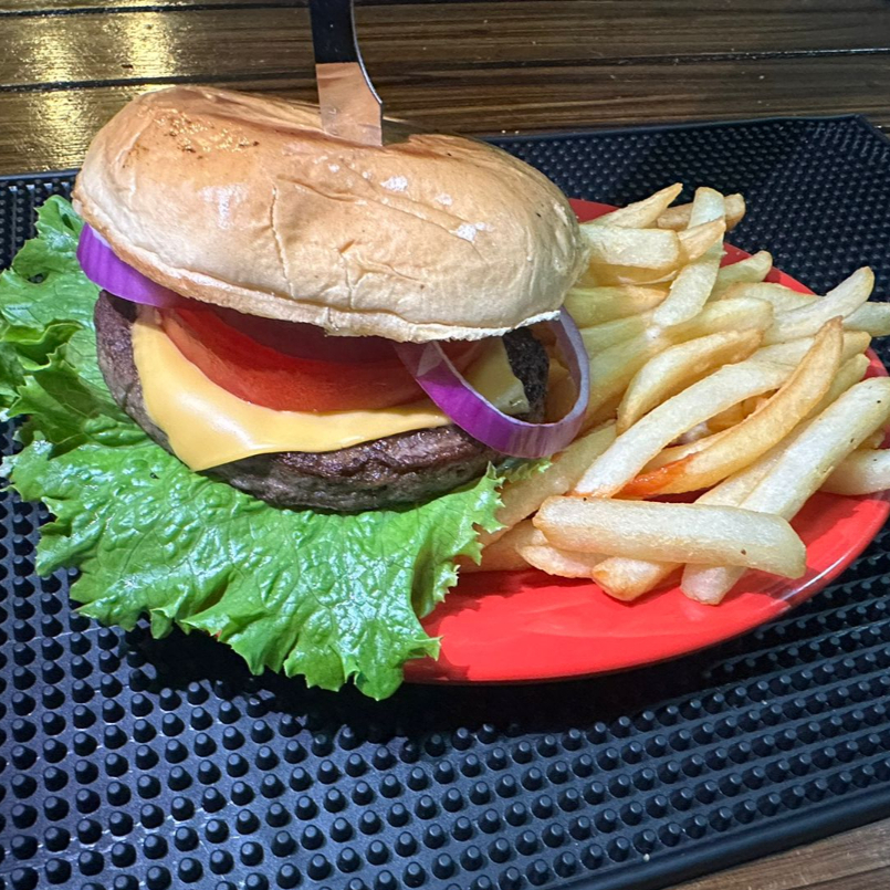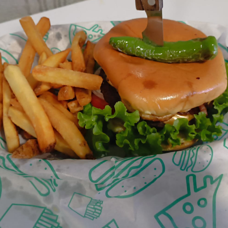Hamburguesa de arrachera hecha a la plancha con queso, cebolla, jitomate y lechuga. Acompañado de una porcion de 120gr de papas a la francesa
