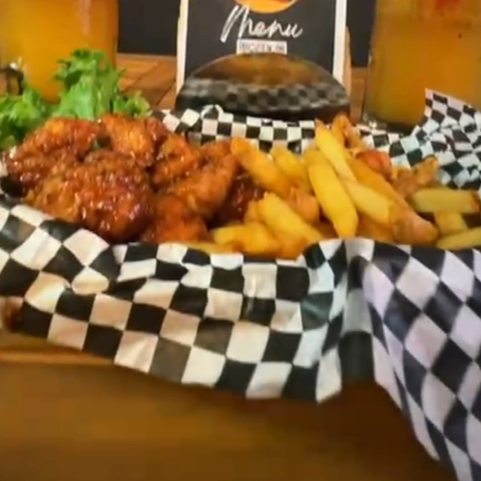 Orden de 1Kg de pechuga de pollo empanizado (pesado en crudo), bañado en salsa de hasta 2 sabores a elegir; acompañado de una orden de papas a la francesa