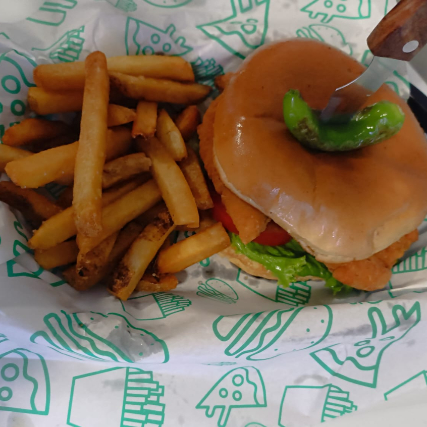 Hamburguesa de pollo empanizado tipo tenders con lechuga, jitomate y cebolla; acompañado de 120gr de papas y un cup de salsa a elegir