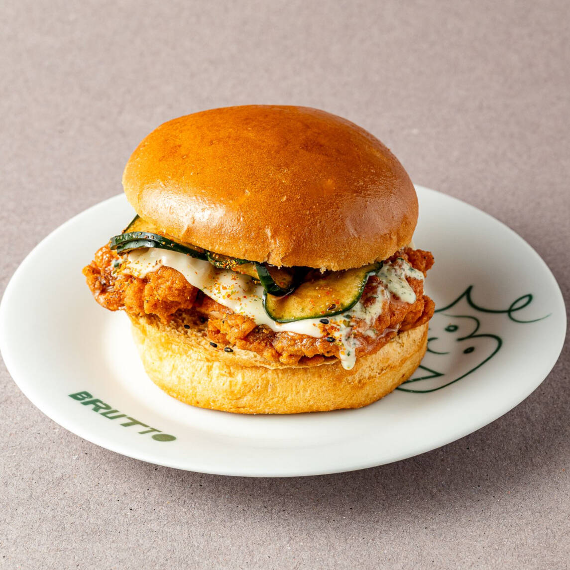 Hamburguesa de pollo frito servida en pan brioche, acompañado con pepino encurtido, alioli de yogurt y miel con un toque de togarashi.