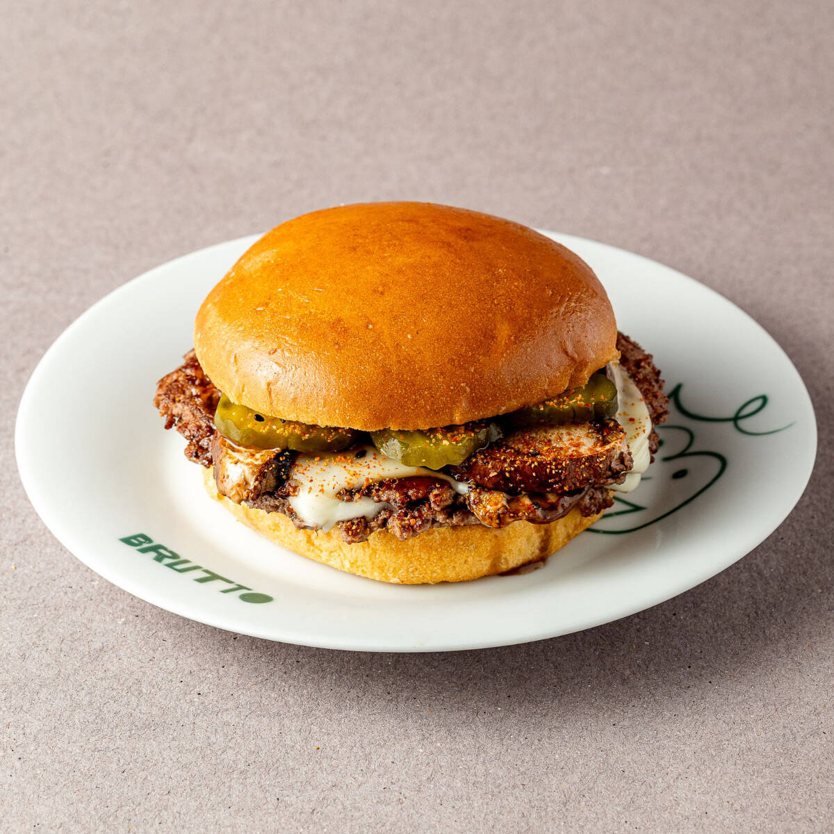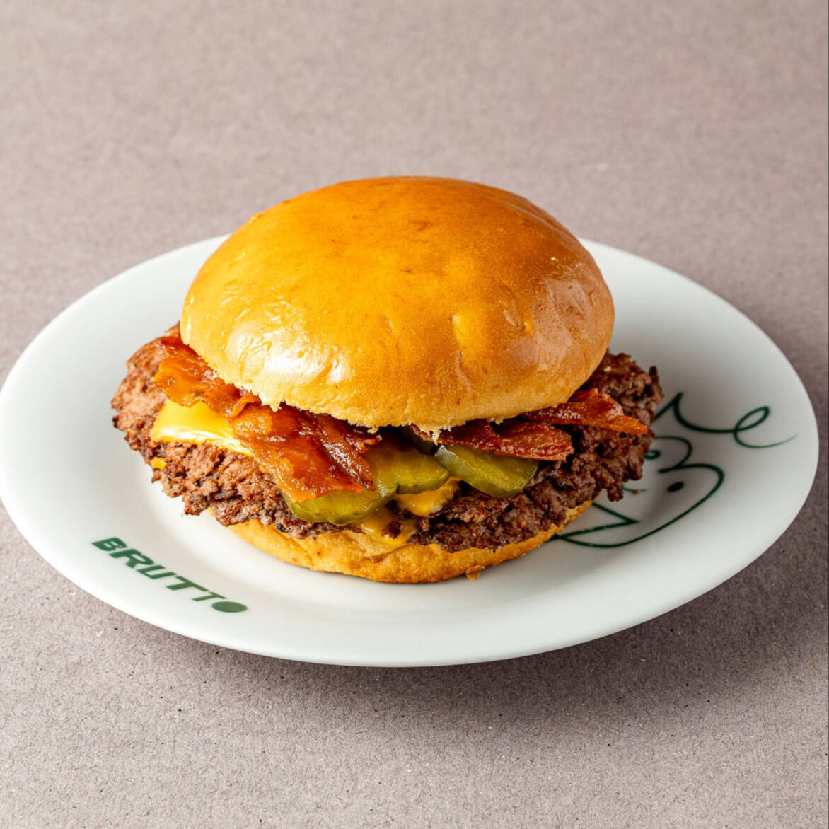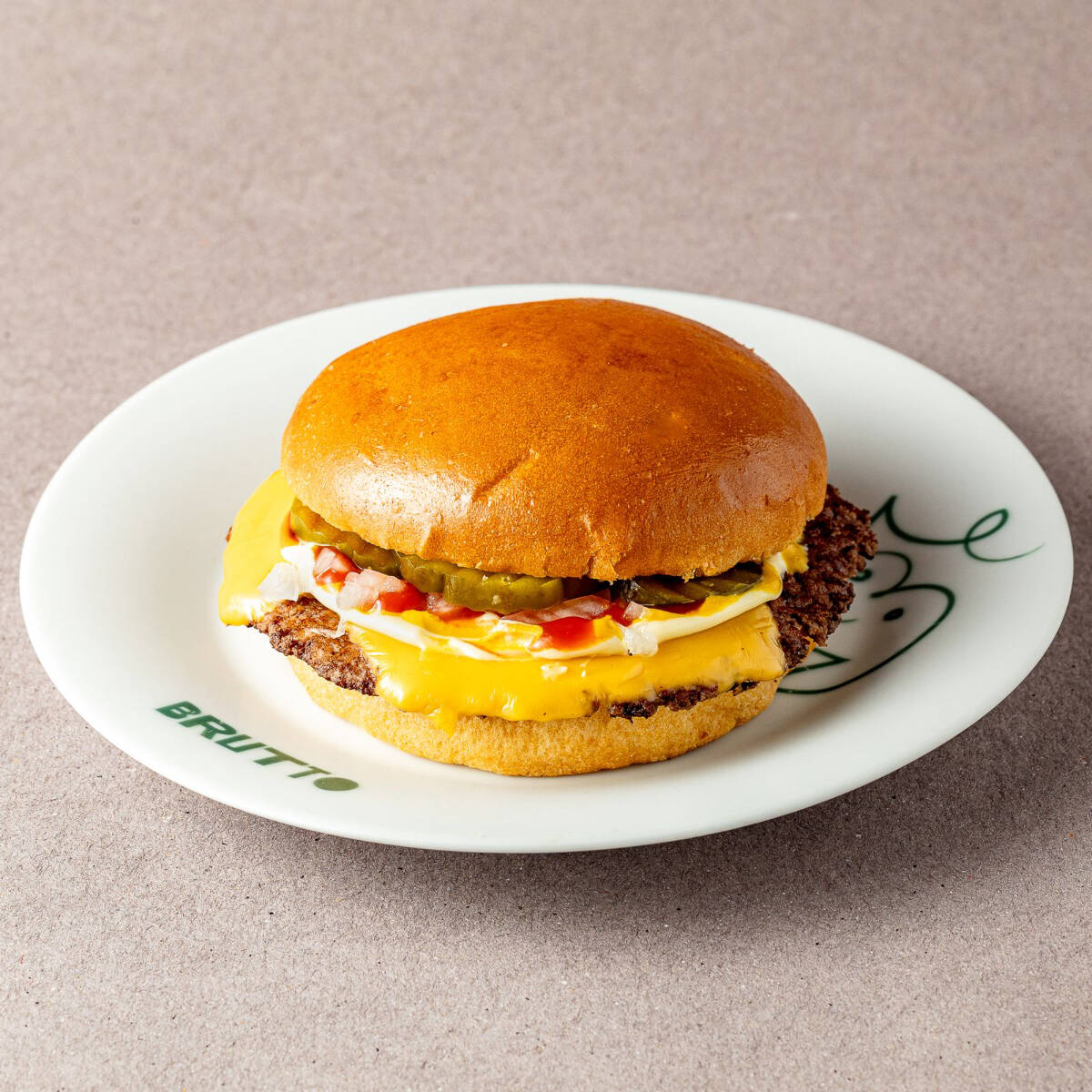 Hamburguesa de carne con queso cheddar derretido, pepinillos rebanados y cebolla. Servida en pan brioche, cátsup, mostaza y mayonesa.
