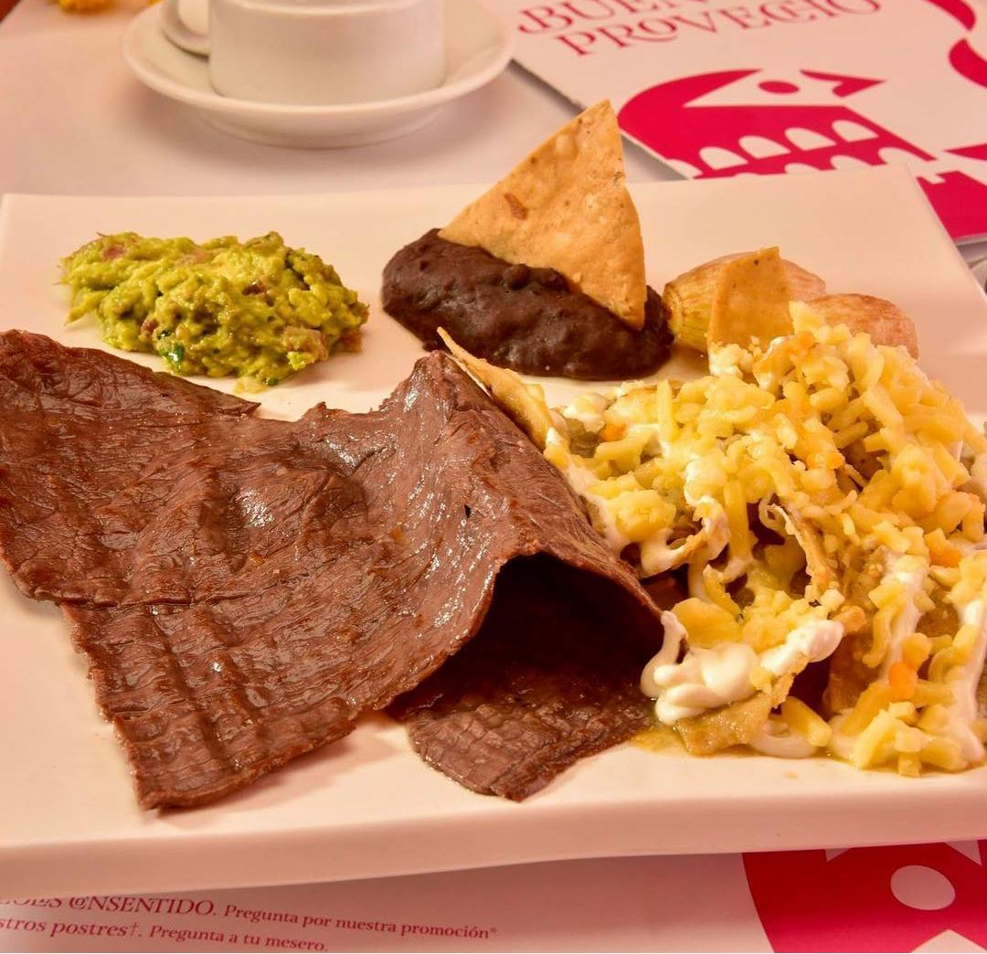Acompañada de chilaquiles, guacamole, cebollas cambray y frijoles de la olla. Todos los desayunos incluyen café y jugo de naranja o fruta.